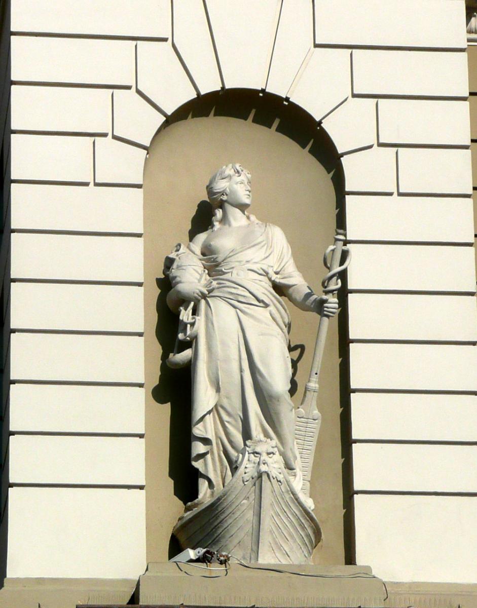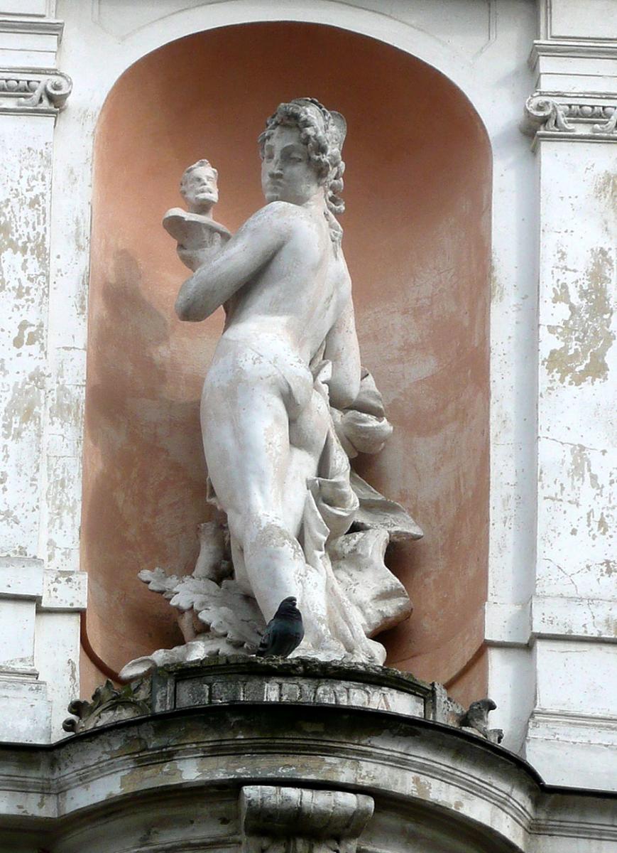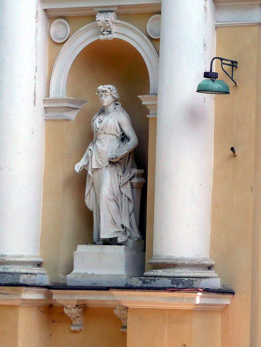 У бічних нішах фасаду сидять дві великі алегоричні жіночі фігури. Ліворуч – усміхнена “Комедія” з маскою (автор Тадеуш Баронч), праворуч – “Трагедія” зі стилетом в руках (автор Антоній Попель).