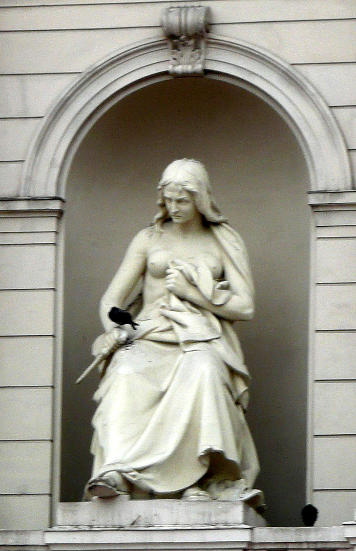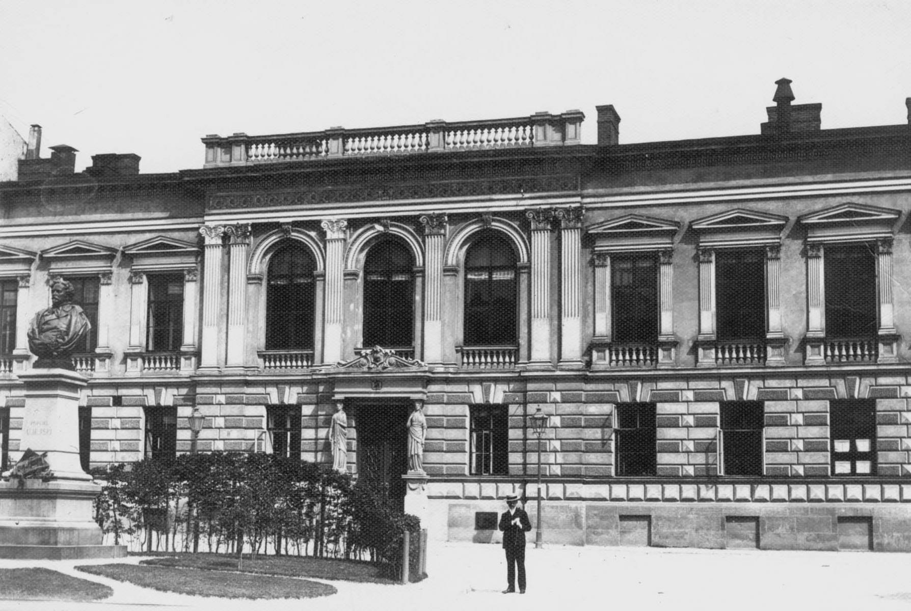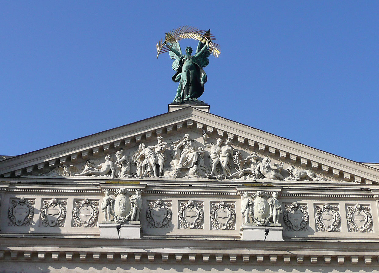 Фриз фасаду двічі розривається парними постатями муз, які вирізьбили з пісковику скульптори: Юліан Марковський (Полігімнія); Тадеуш Вишневецький (Ерато та Каліопа); Юліуш Белтовський (Терпсихора), Тадеуш Баронч (Мельпомена й Талія), Антоній Попель (Евтерпа).
