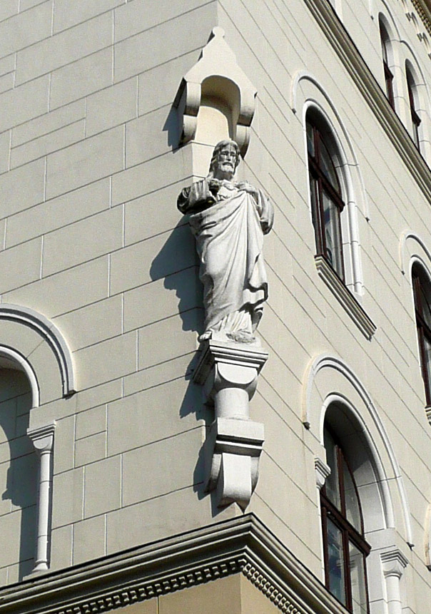 Будинок на нинішній вулиці Князя Романа, 1-3 збудували у 1891–1895 роках за проектом архітектора Францішка Сковрона. Його називали Палацом справедливості. У 1893 році центральний ризаліт споруди увінчала нині пошкоджена скульптура «Правосуддя» авторства Леонарда Марконі. У 1897-му він за допомоги Антонія Попеля доповнив бічний фасад будівлі з боку Галицької площі двома необароковими статуями «Справедливість» і «Законодавство». На жаль, вони не збереглися. Сам А.Попель 1896 року виготовив алегоричну скульптуру «Правосуддя» та фігури двох левів, встановлені у вестибюлі будівлі.