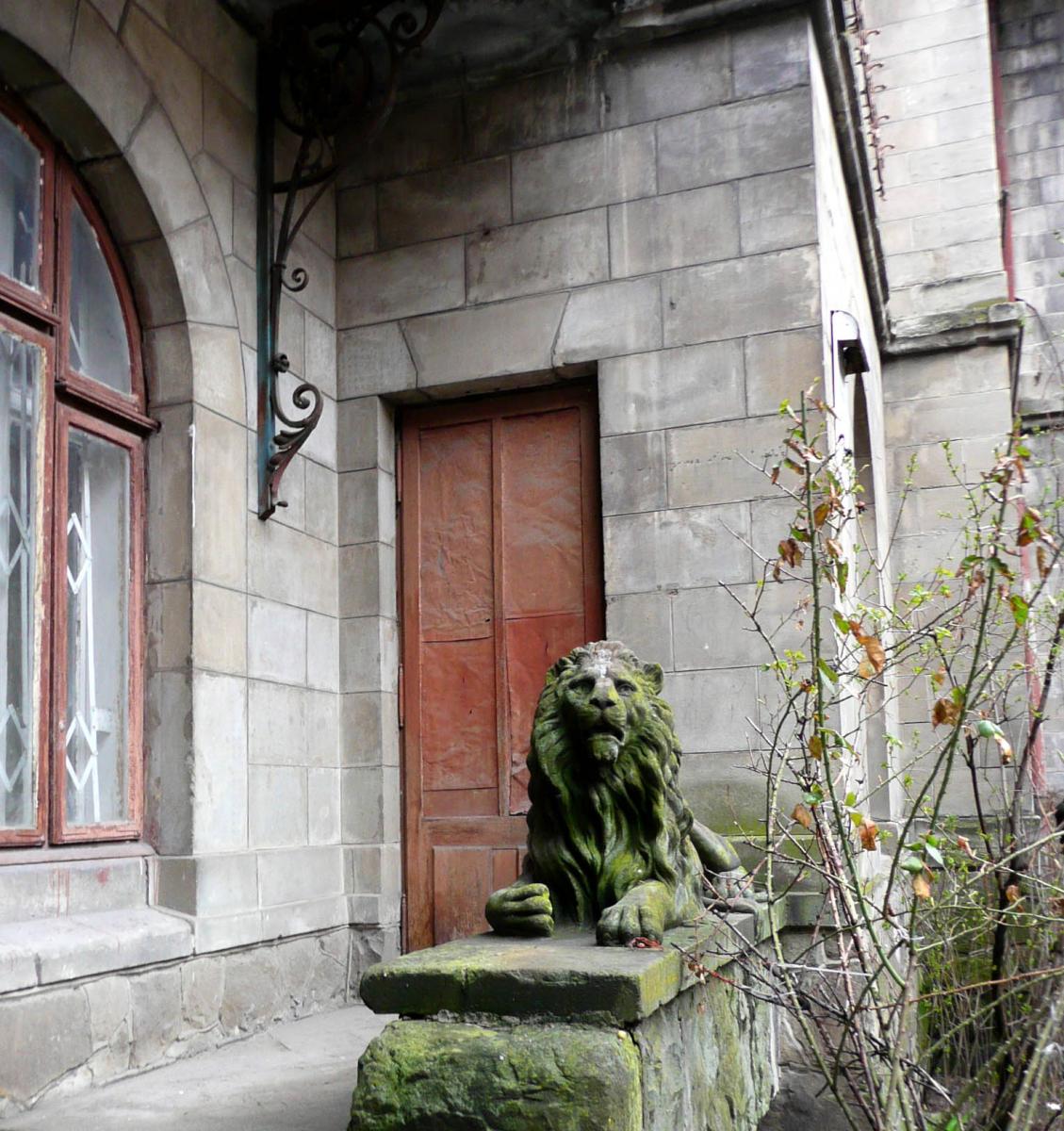 Перейдемо на вулицю Генерала Чупринки. Житловий будинок з вежею під №50 збудував архітектор Юзеф Сосновський у 1900–1908 роках. Скульптурне оздоблення фасаду будівлі ймовірно зробив Антоній Попель. Біля входу в будинок лежить його кам’яний лев.