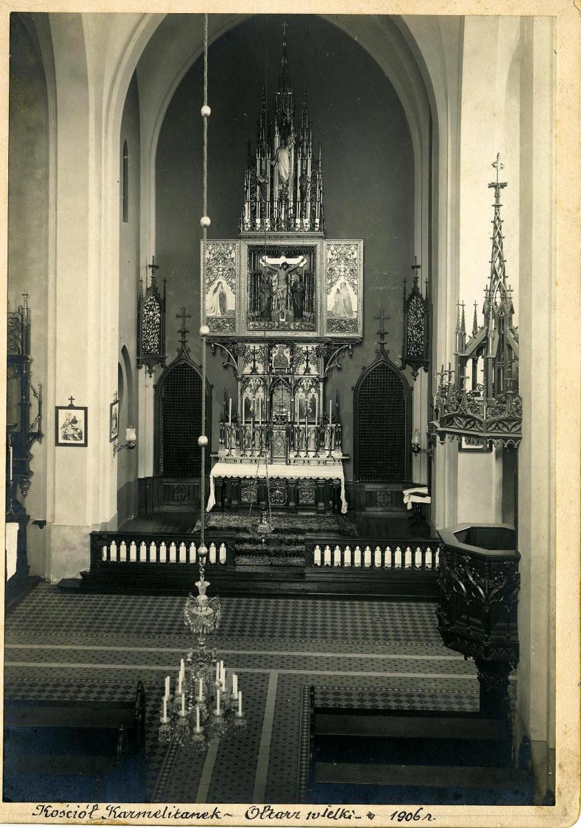 Далі, під №70 стоїть храм, який тепер належить греко-католицькій громаді Св. Климентія Папи. Цей монастирський комплекс у 1893–1895 рр. спорудив будівничий Іван Левинський за проектом архітектора з Кельна Франца Штатца для сс. Кармеліток Босих. За радянських часів багате оздоблення храмового інтер’єру, створене архітектором Ю.Захаревичем і скульптором А.Попелем, було знищене. Головний вівтар був виконаний в формі триптиху, в якому були вміщені оригінальні поліхромовані скульптури Розп’яття, Божої Матері та Євангеліста Івана, створені 1895 року А.Попелем (парафіянином цього костелу Божої Матері Неустанної Помочі та Св. Йосифа). На щастя, скульптури збереглися (1946 року їх вивезли черниці до польського міста Каліша) ².