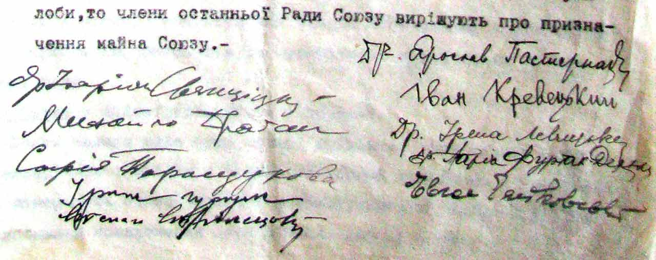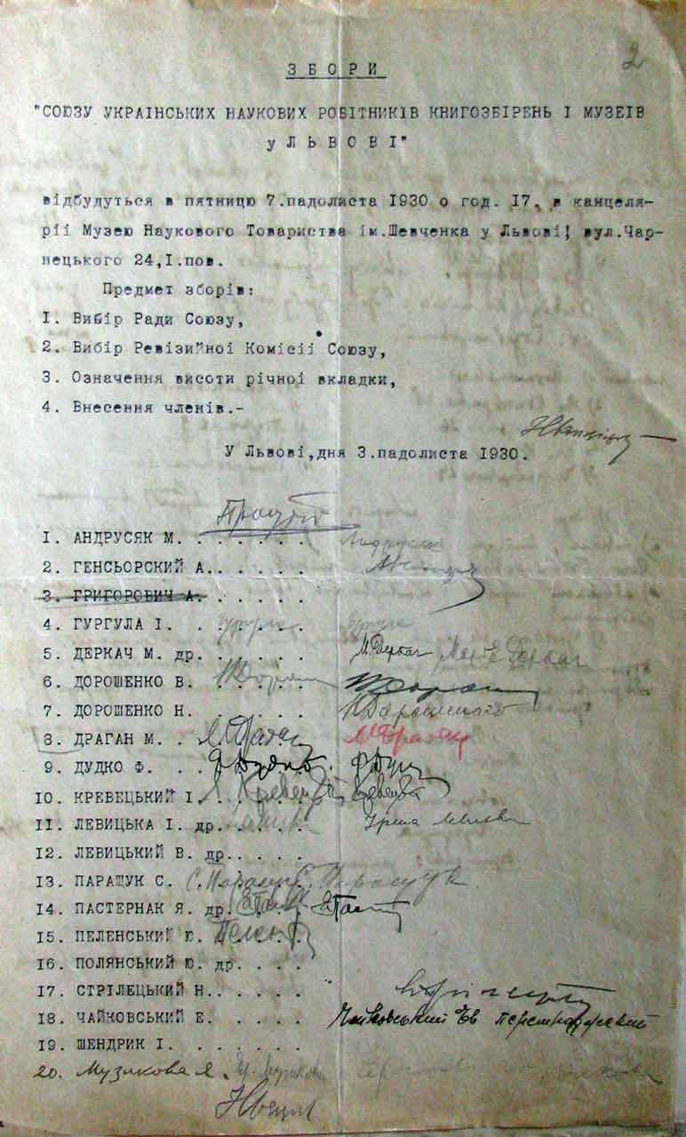 - Союз, як покликаний до сторожі музейного й книгозбірного добра, взиває всіх членів з провінції прилучитися до привіту Урядові і Армії СССР з приводу звільнення земель Західної України і Білоруси від чужевластя.