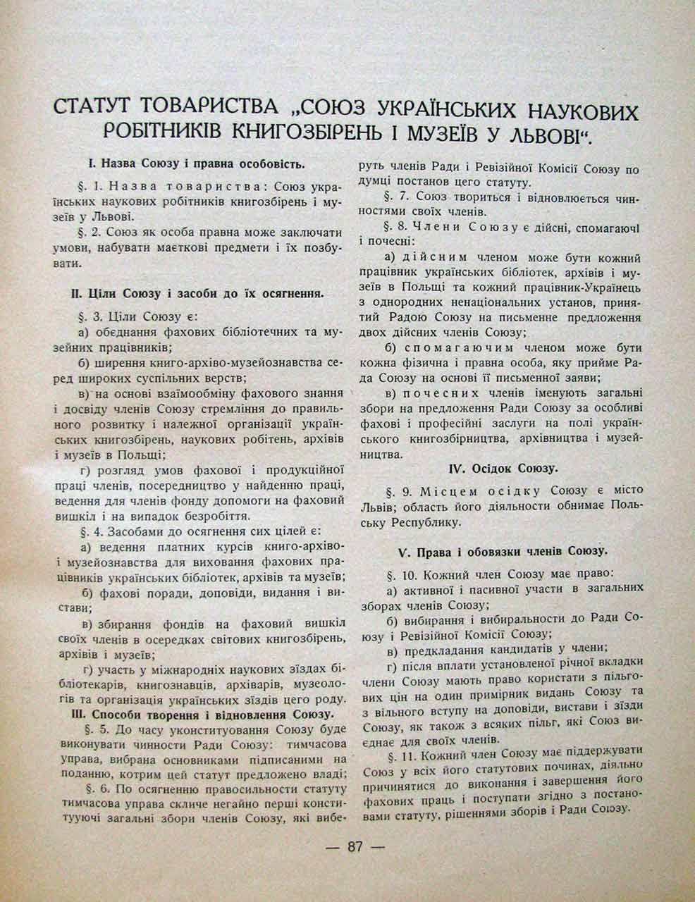 в) на основі взаїмообміну фахового знання і досвіду членів Союзу стремління до правильного розвитку і належної організації українських книгозбірень, наукових робітень, архівів і музеїв в Польщі.