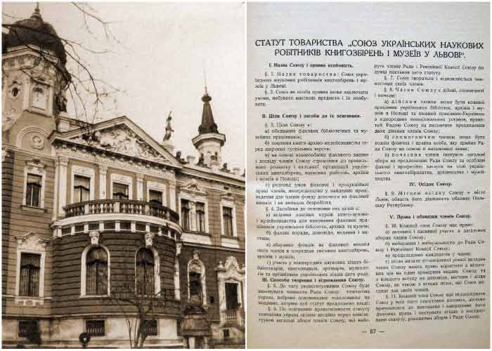 „Союз українських наукових робітників книгозбірень і музеїв у Львові постановою Львівського Воєвідства з 29. Вересня 1930 р. дістав право приступити до статутної діяльности. Правничу редакцію статуту дав д-р Кость Левицький; професійну основу поклали члени-основники за почином директора національного Музею Іляріона Свєнціцького“ — можна прочитати на першій сторінці 228 числа часопису „Діло“ за 14 жовтня 1930 р.