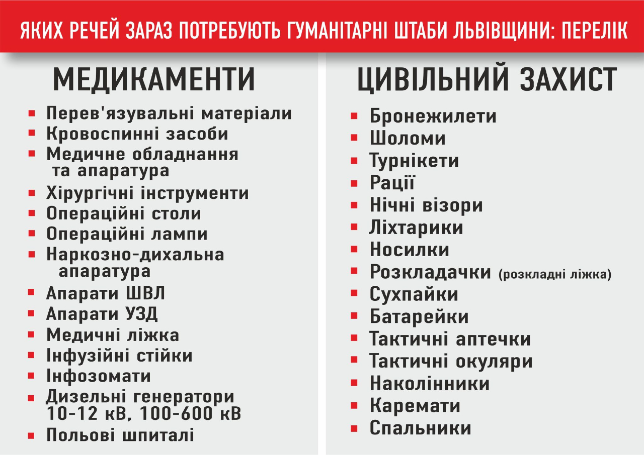 Також потрібні інфузійні стійки, інфузомати, дизельні генератори 10-12 кВ, польові шпиталі, сухпайки, батарейки, тактичні аптечки та окуляри, наколінники, каремати, спальники.