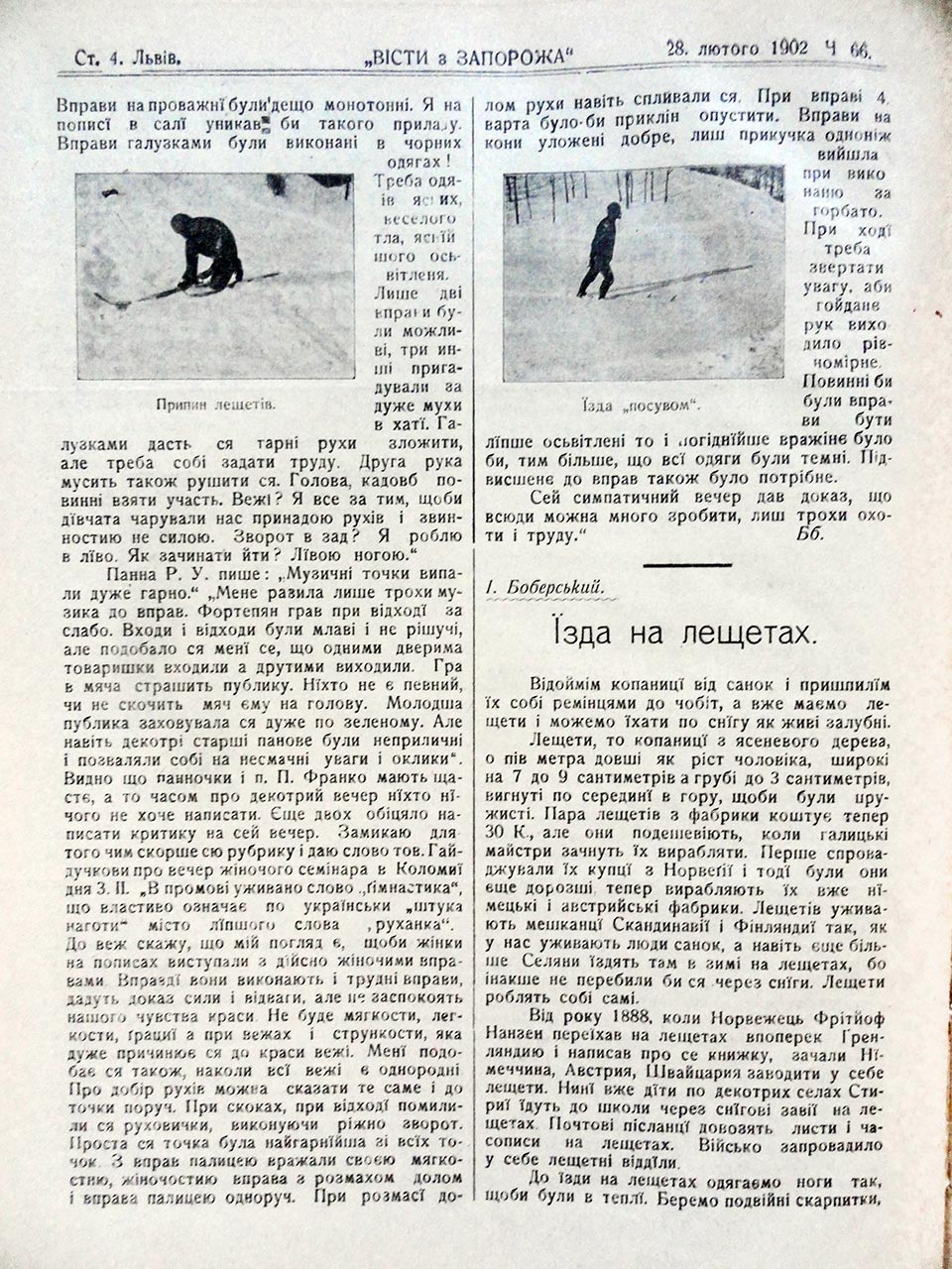 Мушу підчеркнути, що й у нас на цьому полі слідний поступ. Вже в початках нашого лещатарства маємо нарис їзди на лещатах. В 1912 р. І[ван] Боберський подає нарис їзди на лещатах у «Вістях з Запорожа». В р. 1925 у своїх перших числах як «Багаття», так і «Молоде Життя» (оба пластові часописи) займаються лещатарством фахово. «Молоде Життя» дало образковану статтю – переклад з французького, як їздити на лещатах. До речі французи запозичили образки від німців. Державне видавництво України пустило в світ книжечку д-ра В. А. Бляха «Зимовий спорт». В ній посвячено лещатарству 24 сторінки п[ід] з[аголовком] «Лижви» (назва взята від москвинів).