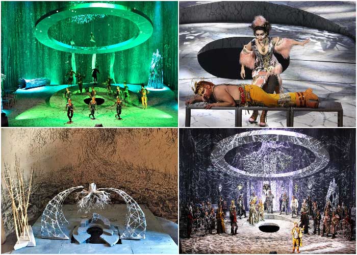 - Домінантою сценографії є архітектонічний елемент, велетенське коло-обруч що нависає по центру над планшетом сцени та її персонажами