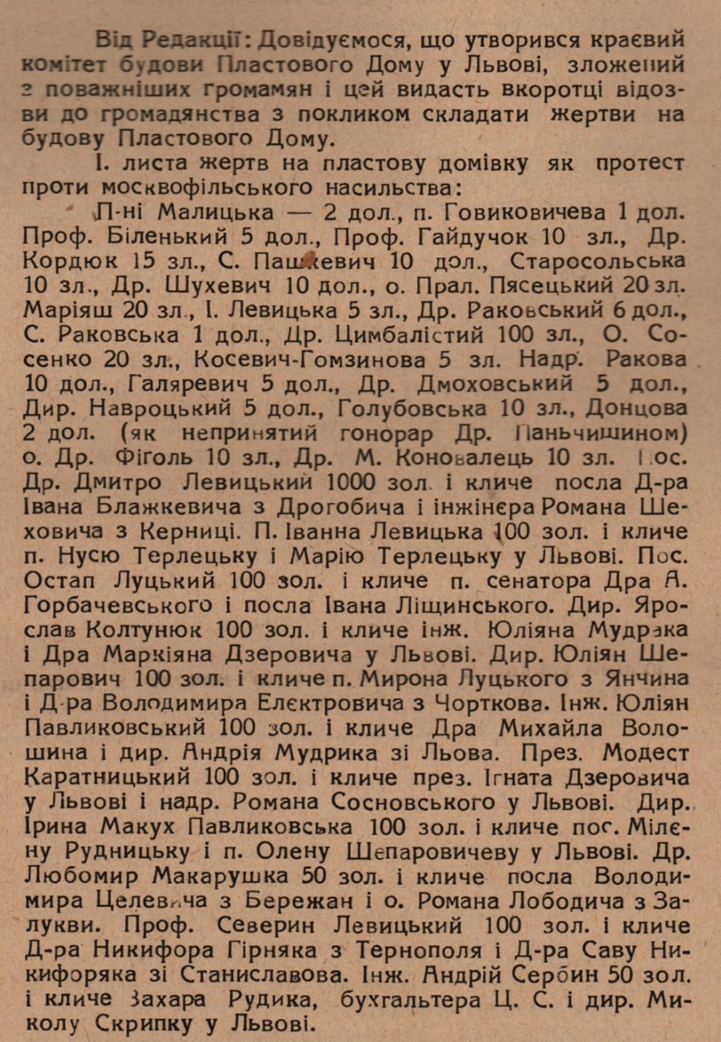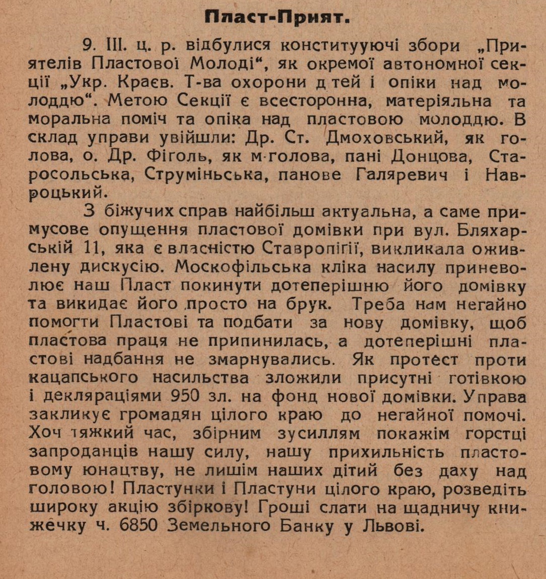 Окрім того, 9 березня відбулися установчі збори «Приятелів Пластової Молоді», як окремої автономної секції «Українського Крайового Товариства охорони дітей і опіки над молоддю». Метою створення секції була матеріальна та моральна допомога пластовій молоді. Головами управи стали Степан Дмоховський та о. Др. Фіголь. Першочерговим завданням «Приятелів Пластової Молоді» стало набуття нової домівки для пласту «щоб пластова праця не припинилася, а дотеперішні пластові надбання не змарнувалися» («Неділя» ч.13 від 30 березня 1930 р.)