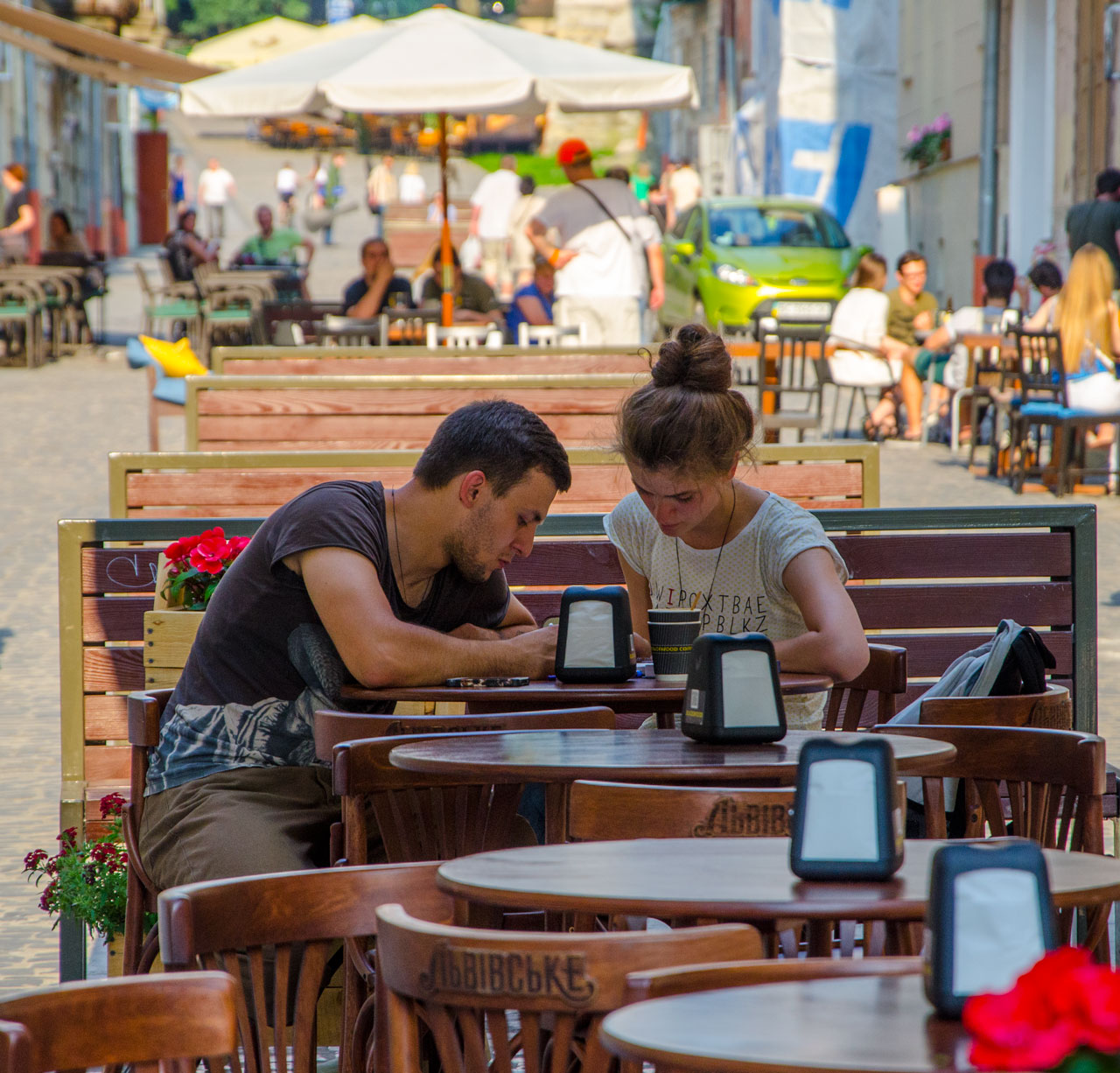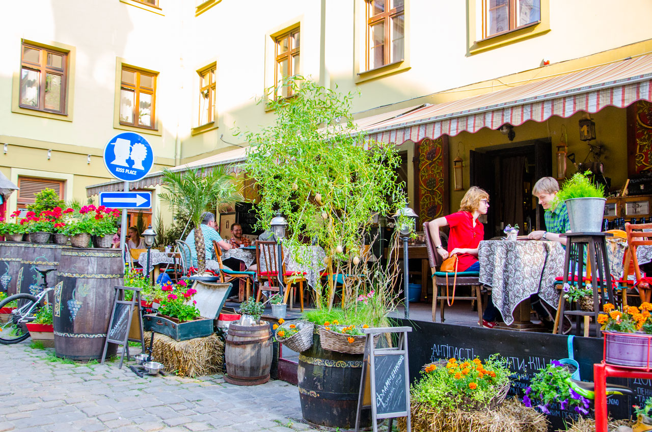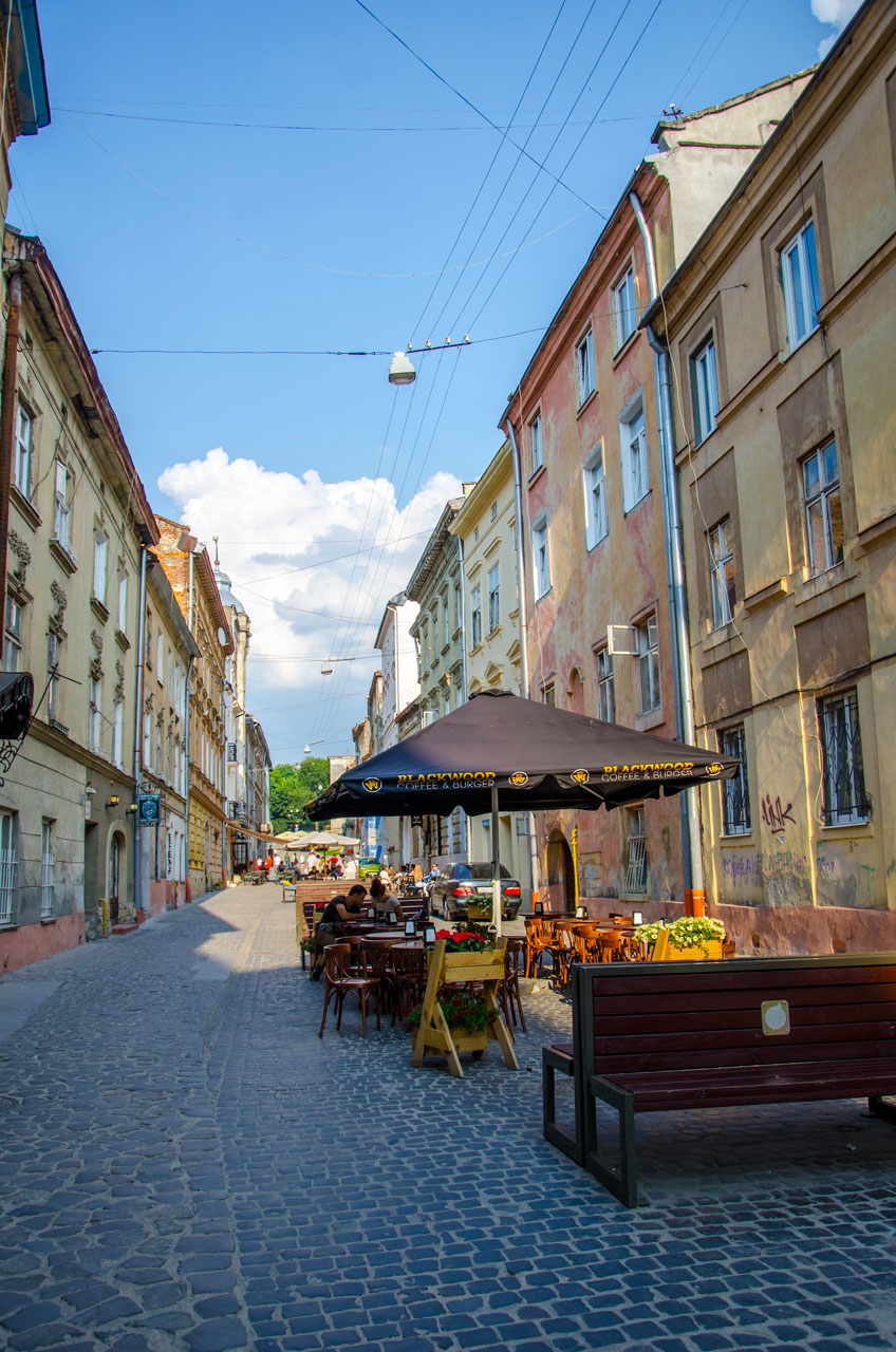 По-особливому затишна пішохідна вуличка, що обладнана лавочками просто посередині, за теплої пори року перетворюється на майже суцільну кав’ярню. А в променях вечірнього сонця вулиця набуває ще більшої чарівності та магічності.