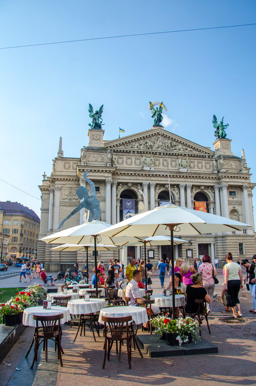«Біля Оперного» – традиційне місце зустрічей друзів, і, звісно, закоханих. Влітку краси місцю додає фонтан та вуличні кав’ярні.