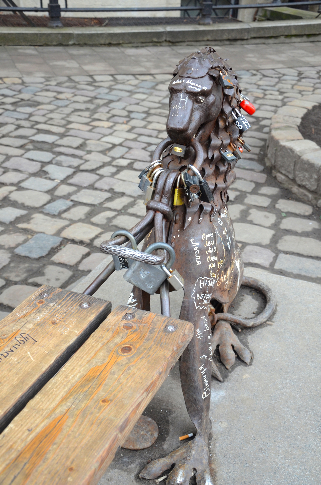 Лавку створили і подарували місту в 2008 році 10 майстрів «Товариства Залізного Лева». Під час створення народилася легенда: якщо закохана пара взявшись за руки одночасно сяде на лавку, їхнє кохання буде довге і щасливе. Лавку тримають леви, а отже окрім довгого і щасливого, кохання буде міцним та вірним.