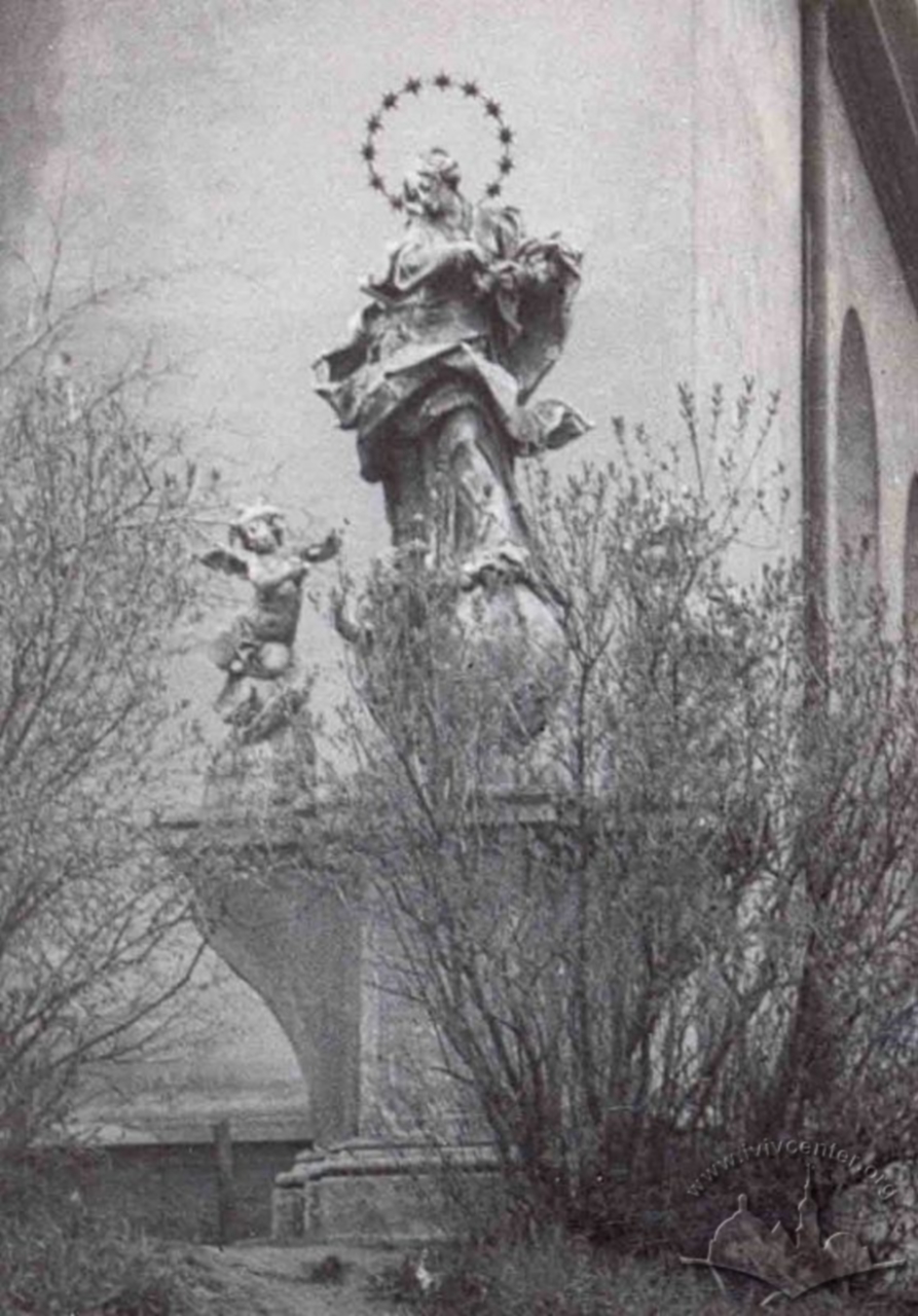 Справжнім шедевральним витвором мистецтва була фігура Матері Божої, що стояла перед костелом Марії Сніжної. Створено її ще у XVIII ст., а авторство приписують Івану Георгію Пінзелю. Початково ця скульптура стояла біля костелу місіонарів на Замарстинові, звідки її перенсли до костелу Марії Сніжної. Дана фігура Матері Божої встояла під час обох світових війн, і навіть на початках радянської влади. Однак десь в середині-кінці 1960-х років, вона непомітно зникла і подальша її доля, на жаль, невідома.