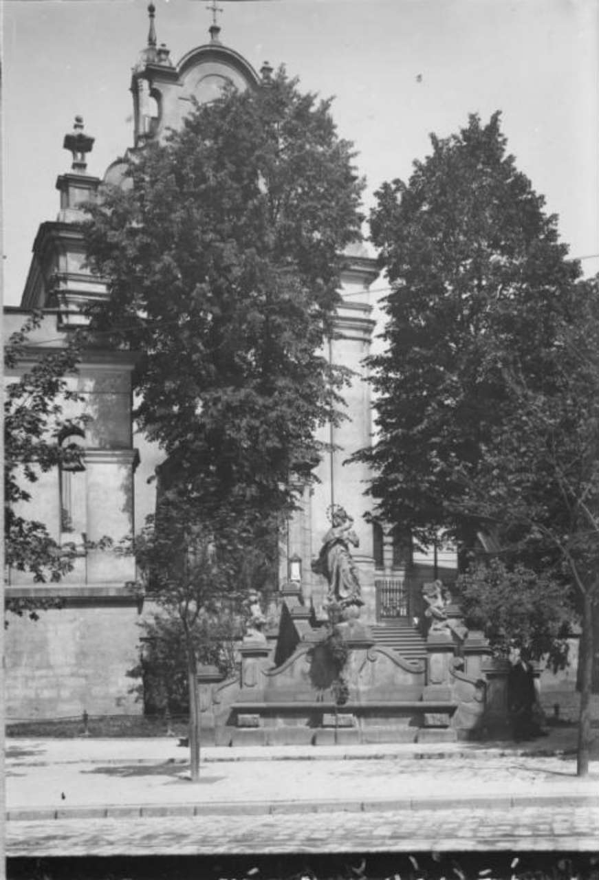 Зовсім поруч до колони Сикстів і скульптури Св. Яна Непомука, але ближче до входу у костел Марії Магдалени, у другій половині XIX ст. було поставлено фігуру Матері Божої. Встояти їй вдалось трішки довша, ніж її «сусідам», однак в 1962 році скульптуру все таки було знесено радянською владою.