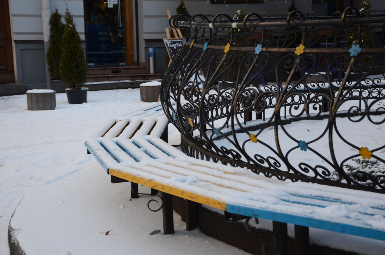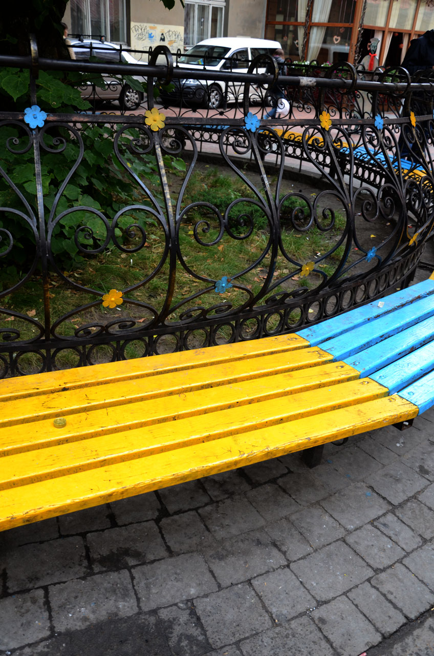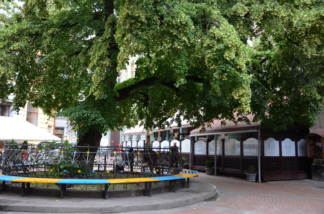 Лавочка у синьо-жовтих кольорах розташувалась у затишному проїзді Крива липа. Навколо того самого дерева, яке дало назву вулиці.