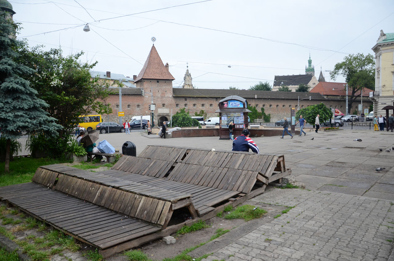 На площі Митній встановилені лавочки, з яких можна подивитись на небо або помріяти. Схожих лавочок у місті ще не було, часом їх називають місцем для засмагання.