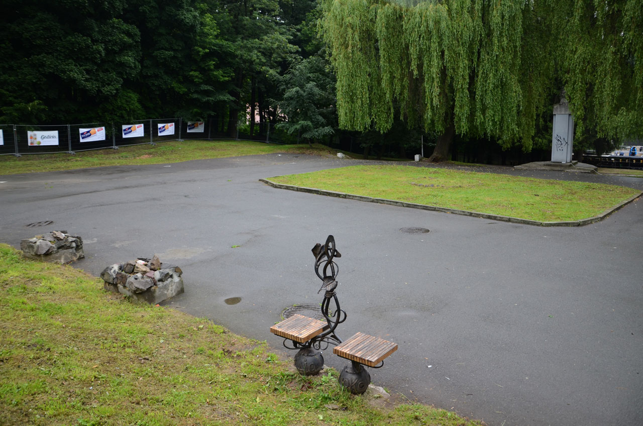 Мила маленька лавочка на два місця розташована в Парку культури. Основою конструкції служать дві великих вишні. Це місце цілком пасує для романтичних посиденьок закоханих.