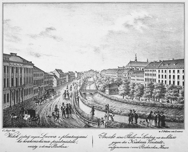 У XVII і XVIII ст. на лівому березі Полтви вже існували кілька палаців і мурованих дворів (палац Коссаковських, Алвертівський двір і ін.). На правому березі міські мури поволі руйнувалися; “в них з’явилися на різних місцях такі діри, що по кільку <чоловік> разом можуть до міста влазити”. Остаточно міські фортифікації розібрала австрійська влада, уживши камінь для брукування вулиць, а цеглу – до засипання ровів, в першу чергу – на валах, які мали стати головним проспектом міста.
