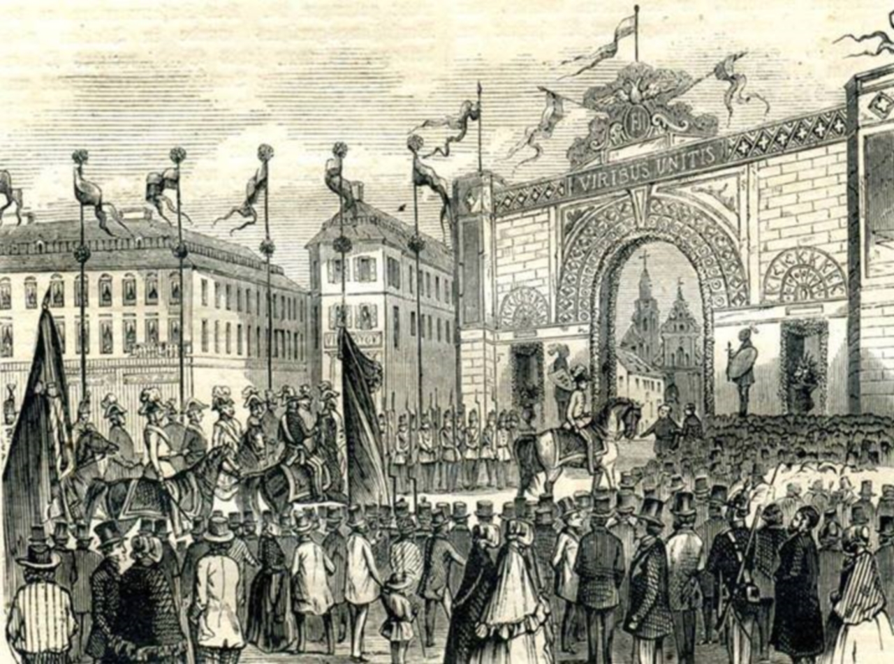 Цікаво, що наступна в історії Львова тріумфальна арка з’являється в місті рівно за сто років – в 1851 році. На цей раз її спорудження було пов’язане з візитом високої особи – імператора Австрійської імперії, до якої і Львів належав, Франца Йосифа. 16 жовтня 1851 року усі бажаючі городяни мали шанс привітати свого правителя на одній із центральних площ міста – площі Фердинанда (тепер пл. Міцкевича), на котрій було зведено Тріумфальну арку. І хоча фотографій цієї арки не існує, проте збереглись літографії, що передають її вигляд. По них, зокрема, помітно що вершину арки було увінчано латинським написом «VIRIBUS UNITIS», що перекладається як «Спільними зусиллями». Зверху над написом майоріли прапори імперії, а по обидва боки від арочного проїзду було поставлено двох лицарів.