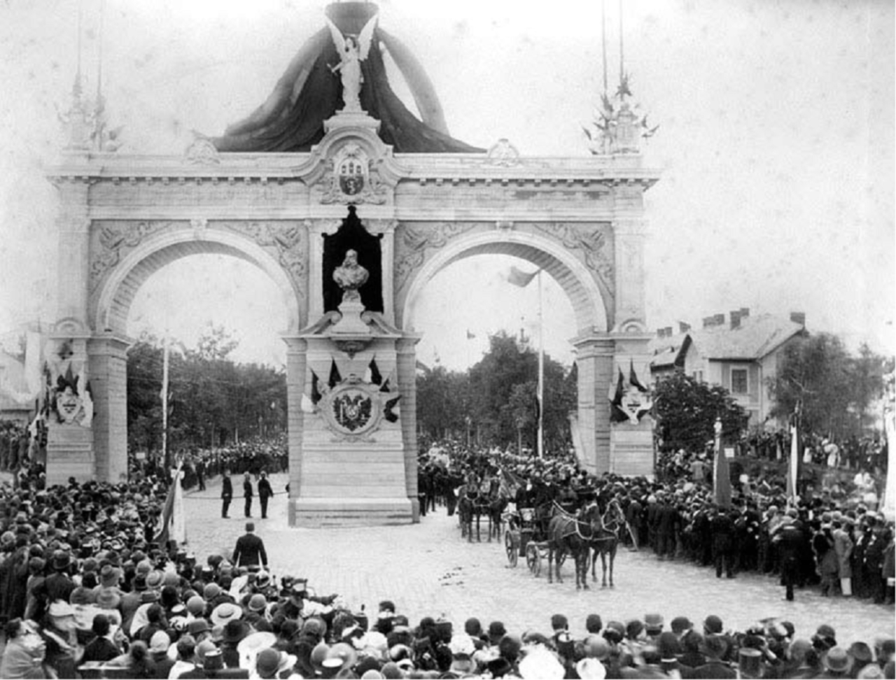 Наступний візит імператора Франца Йосифа до Львова відбувся в 1894 року і був пов’язаний з відвідинами Крайової виставки, що відбувалась тоді у парку Кілінського (тепер Стрийський парк). Оскільки окрім імператора місто мало відвідати близько 1 млн. гостей, то містом однозначно було прийнято рішення про зведення Тріумфальної арки. Дана арка була, мабуть, найбільшою з усіх в історії міста. Як і арка 1880 року, вона була двоарочна. Посередині арки містився бюст імператора. Під бюстом розміщувався герб Австро-Угорської монархій, а над бюстом – герб Львова. Цікаво, що колія електричного трамваю, який саме тоді розпочав свою роботу, проходила під тріумфальною аркою. Хоча дана арка була масивною кам’яною конструкцією, це не завдали їй бути лиш тимчасовим спорудження, котре як і інші попередниці, безслідно зникло, закарбувавшись лишень на давніх світлинах.