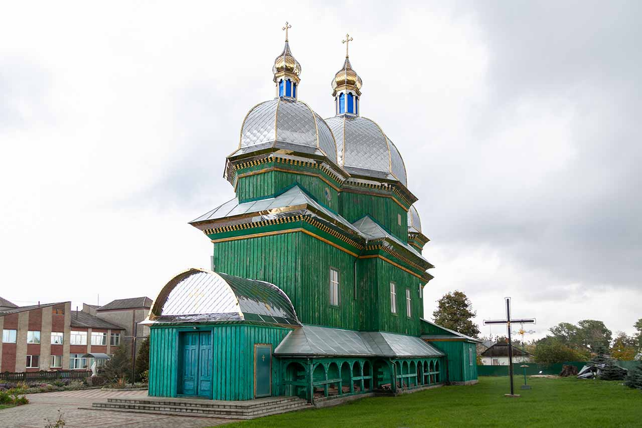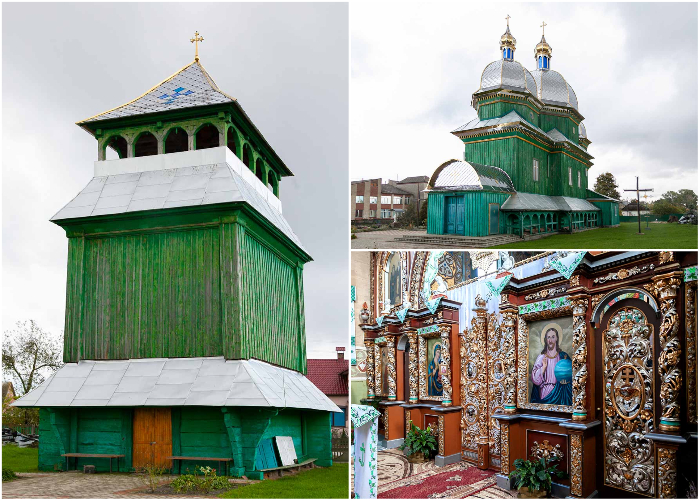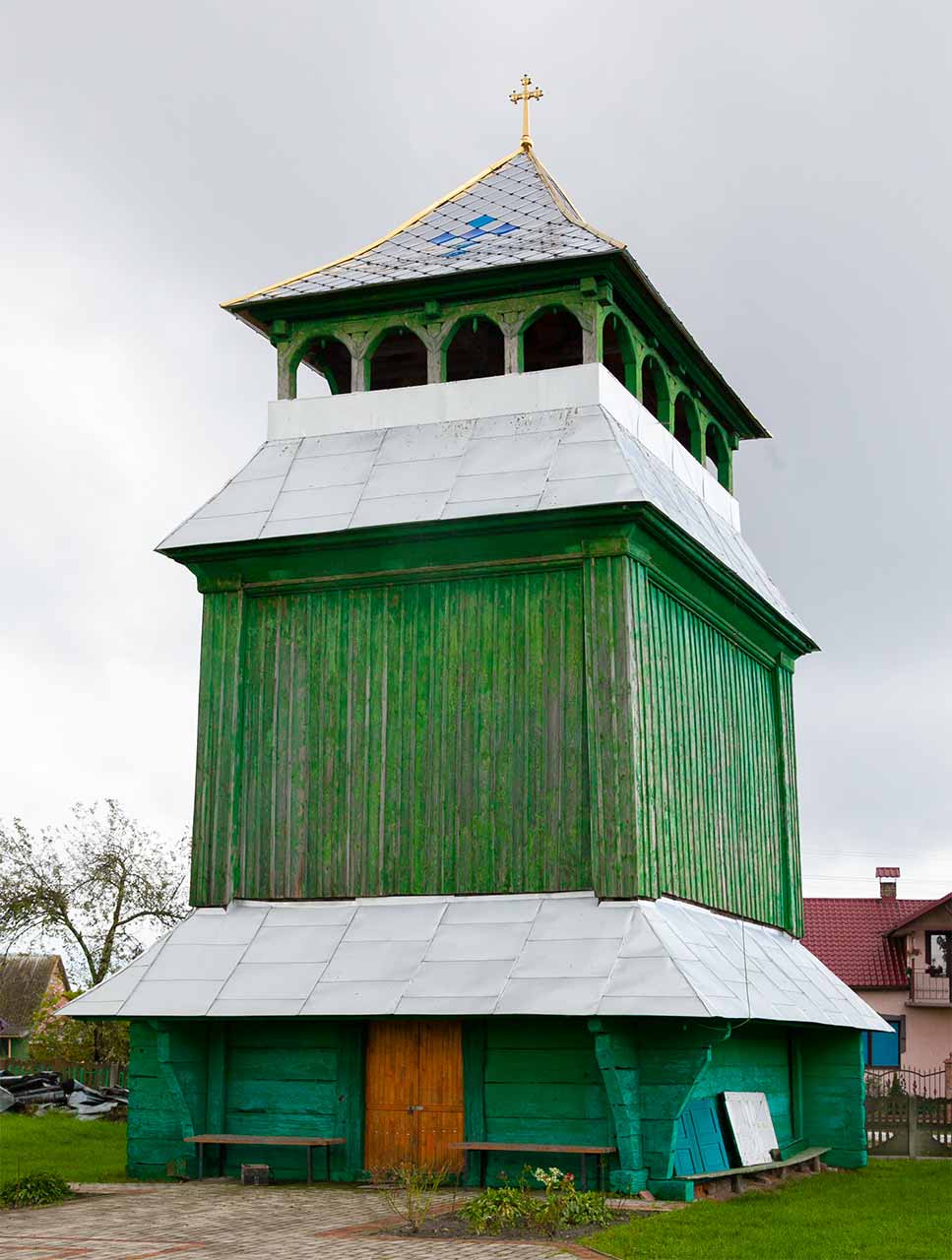 Церкву завершують три світлові восьмерики, накриті банями з ліхтарями і маківками, які підкреслили жовтим кольором. На захід від святині знаходиться велика дерев’яна триярусна дзвіниця 1786 р., накрита наметовим дахом.