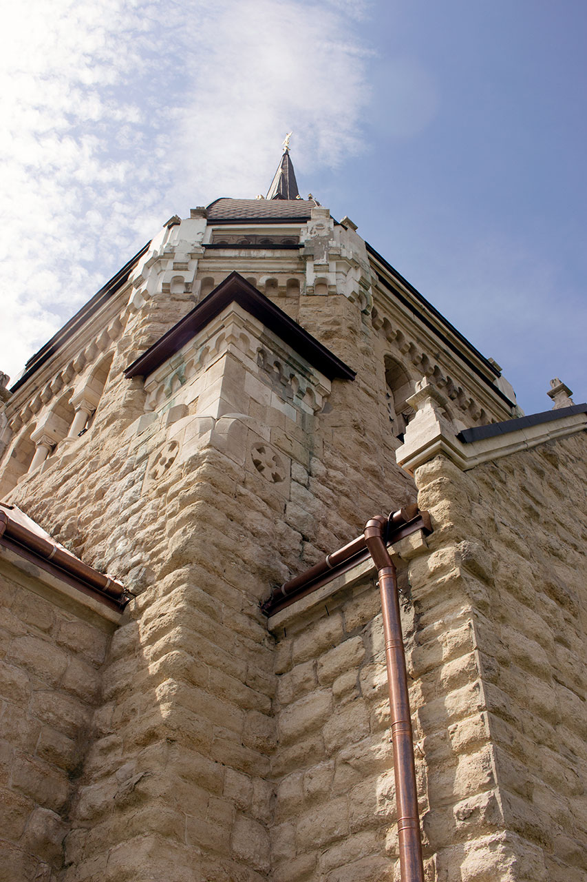 Матеріалом послужила цегла, зовні обмурована грубо обробленим пісковиком, що добувався поблизу. Для архітектурних елементів застосовано дрібнозернистий пісковик із села Демні, що поблизу Миколаєва.