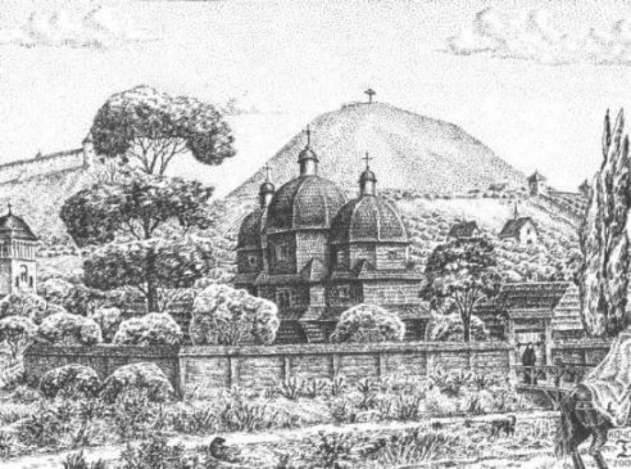 Будівництво дерев’яного храму розпочалось після благословення митрополитом київським Михайлом Рогозою у 1591 році. Грунти під церкву та прилегле господарство були вукуплені та надані володарем Молдови – господарем Василієм Лупулом. У роки Хмельниччини (1648, 1655) монастир та церква постраждали, проте, вже 1659 року були відбудовані.