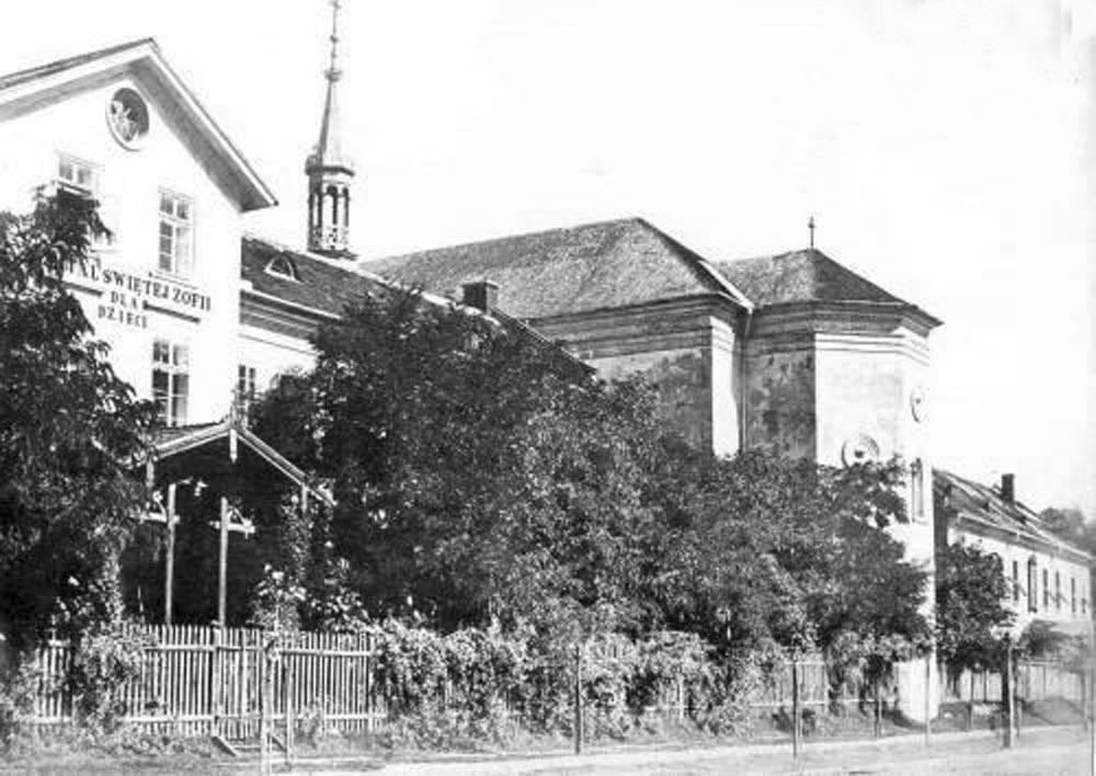 На початку дитяча лікарня Св. Софії знаходилася на ділянці обабіч вулиці Леона Сапіги (нині – вул. Степана Бандери, ділянка, де стоїть будинок № 32), вона входила в комплекс монастиря Св. Терези, який було засновано на початку ХІХ століття. Більшість будинків цього комплексу були споруджені за проектом відомого архітектора Юзефа Франца в 1855 році. До складу закладу Св. Терези входили: костел, освячений на честь цієї святої, монастир сестер Провидіння, дитячий шпиталь Св. Софії, виховний заклад-інтернат для дівчат і жіночий виправний будинок.