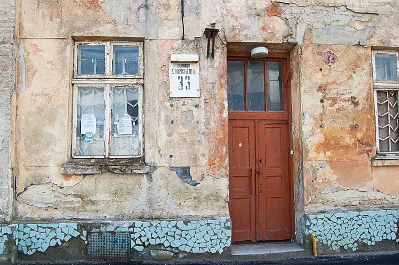 І своїм фасадом, і не тільки фасадом, цей будинок, сильно дисонує зі своїми найближчими сусідами. Тут царюють запустіння та розруха.