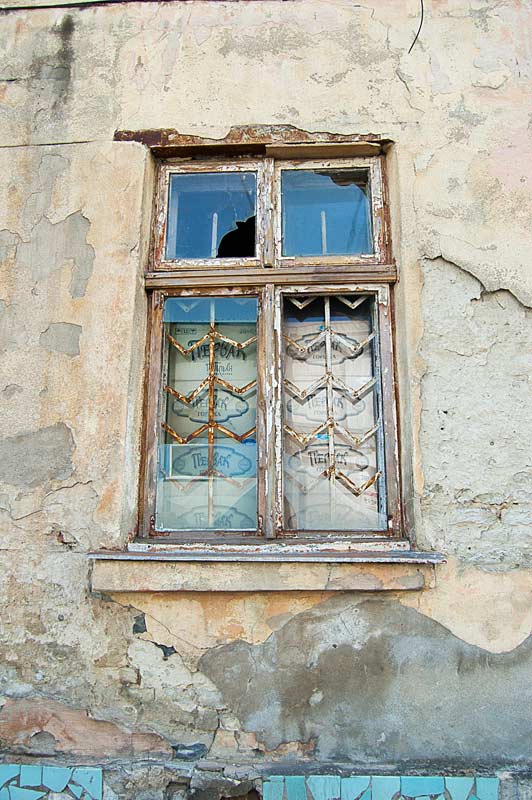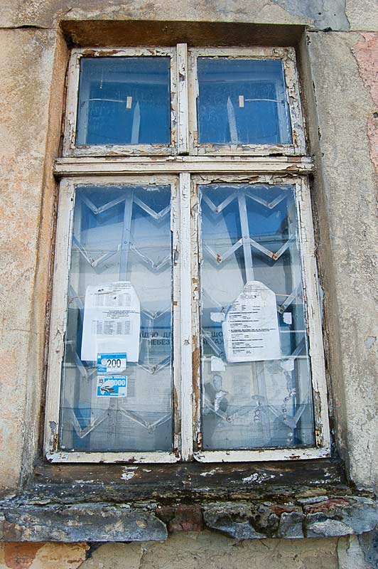 Шибки на вікнах вціліли далеко не всюди і подекуди їх роль виконують шматки фанери, обрізки дощок, картонні коробки. Від стін віє холодом і вогкістю.