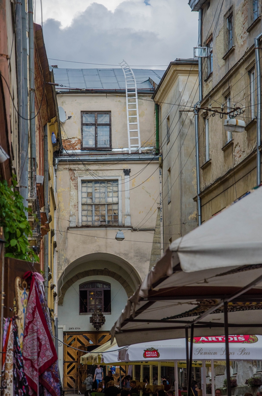 Драбина прикріплена на будівлі культурно-мистецького центру «Дзига», і, щоб її помітити, потрібно підняти голову. Драбина символізує вихід із архітектурного тупіка, а залізти на неї ще не зважився жоден.