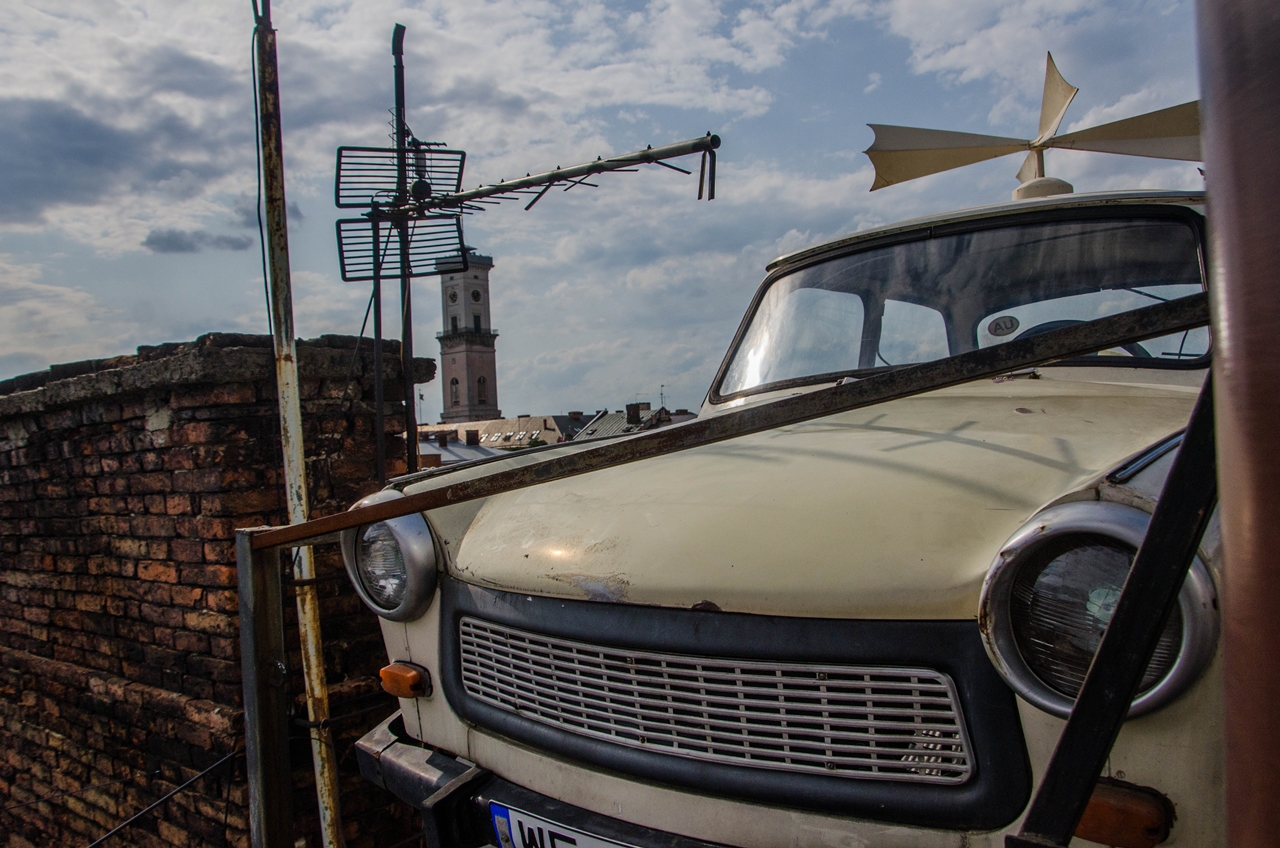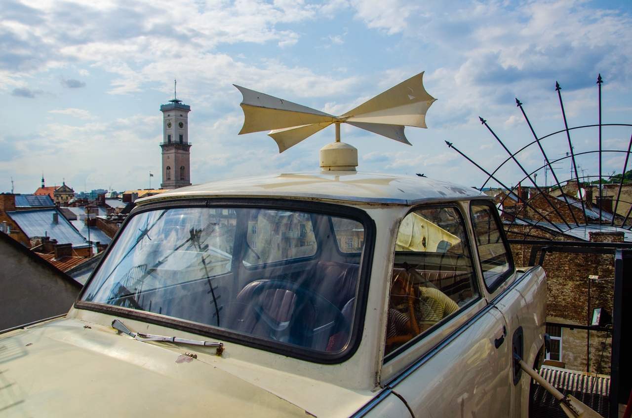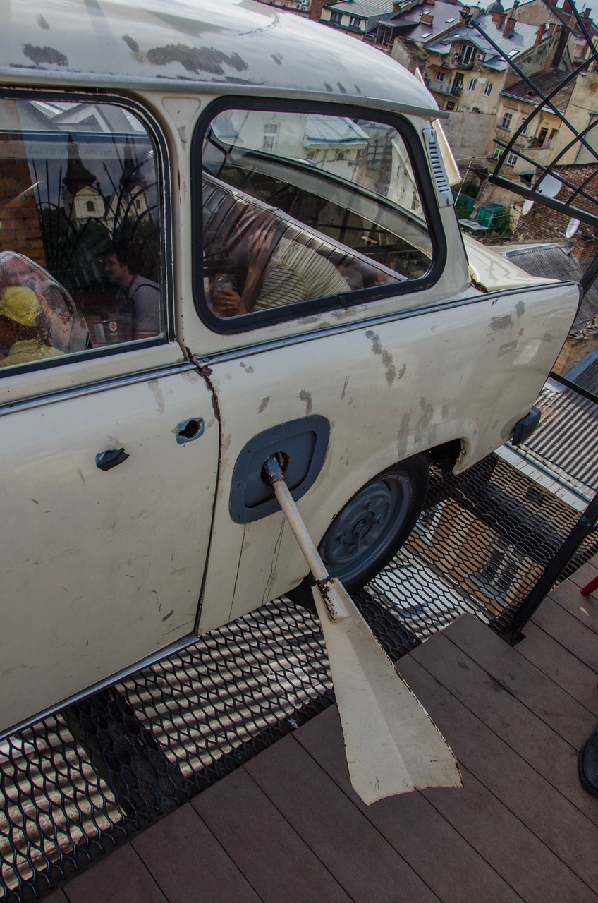 Автомобіль із пропелером та веслами розташувався на даху старовинної будівлі на Староєврейській. Зараз у будівлі розташувалась кнайпа, в якій стверджують, що на даху є авто мануально-гребного приводу, модель «ЕМІР» 1979року, на ходу.