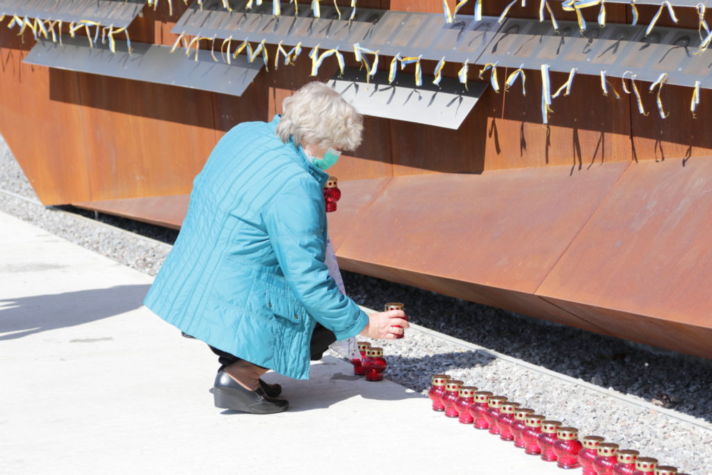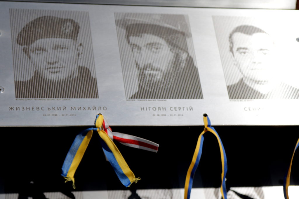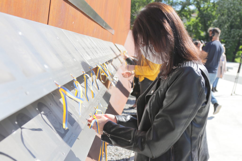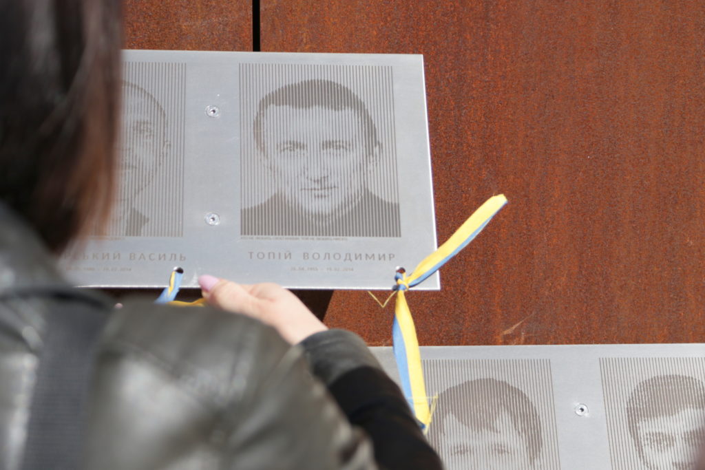 Присутні запалили лампадки та пов’язали синьо-жовті стрічки до кожної з фотографій патріотів на Меморіалі Героїв Небесної Сотні, що на вул. Підвальній, 6.