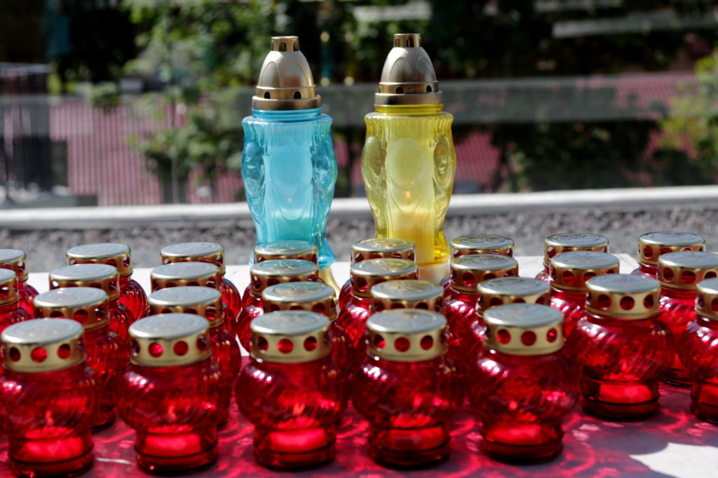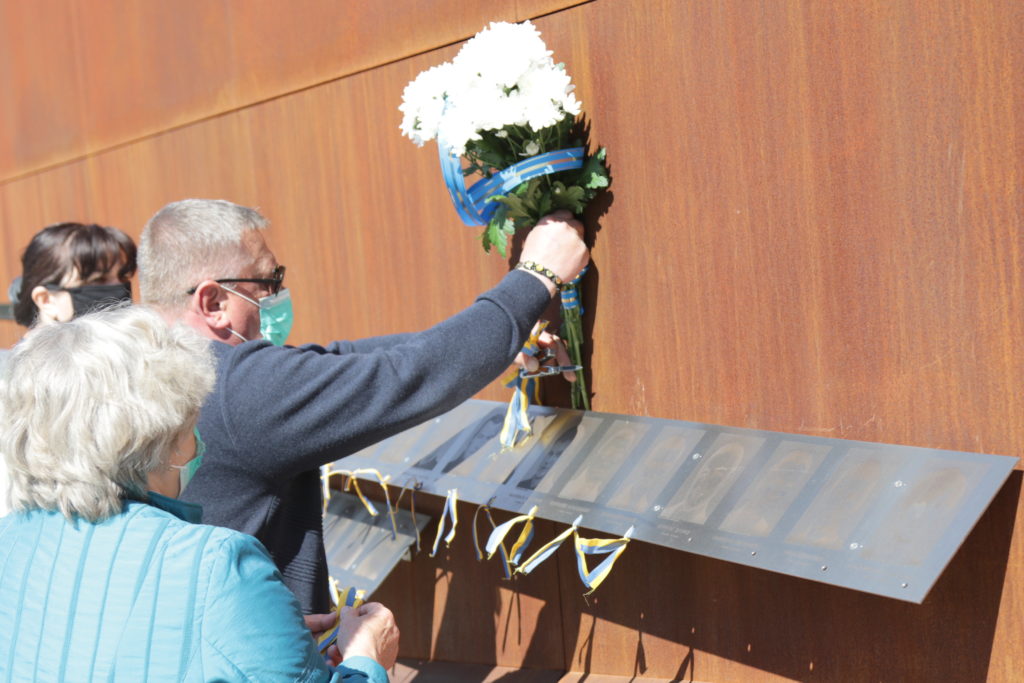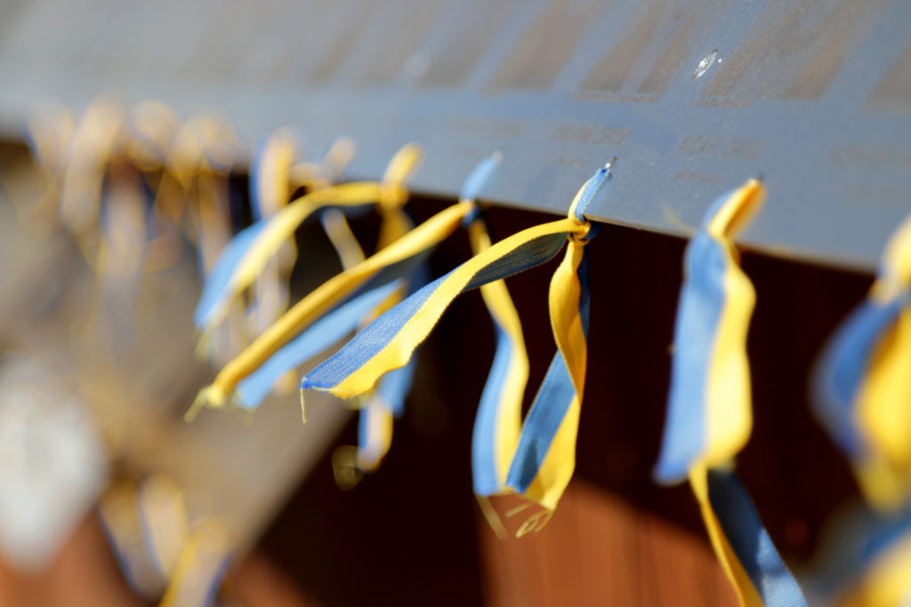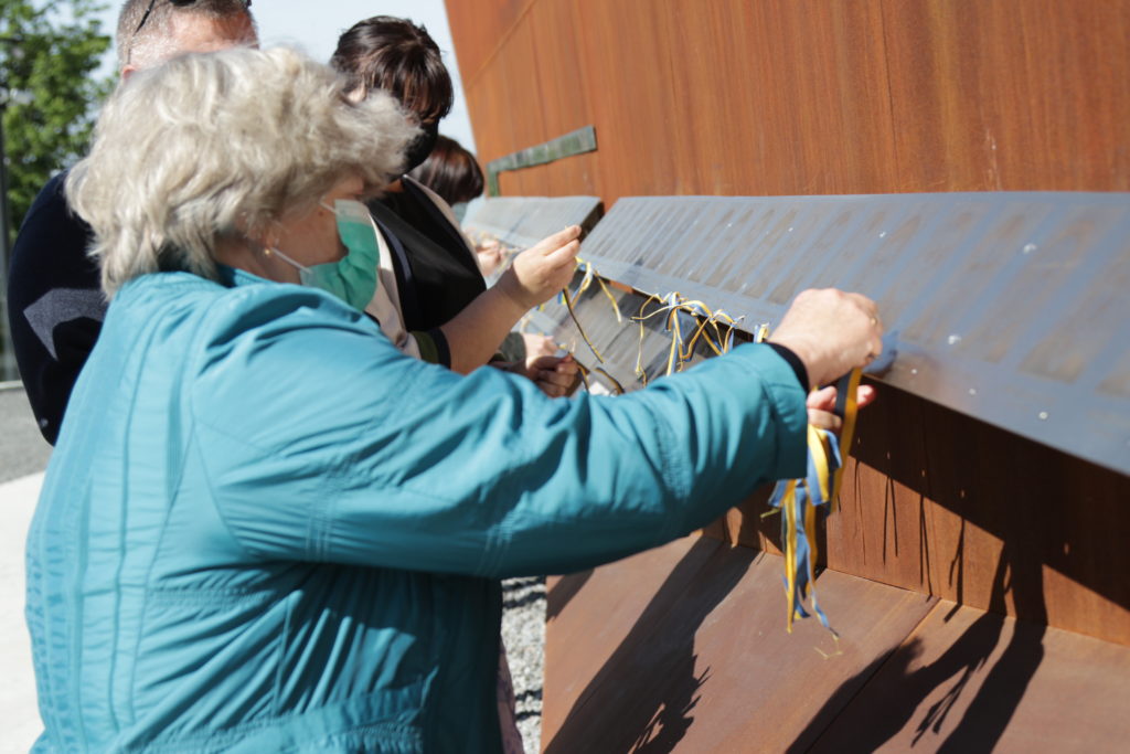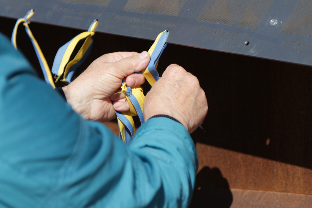 Присутні запалили лампадки та пов’язали синьо-жовті стрічки до кожної з фотографій патріотів на Меморіалі Героїв Небесної Сотні, що на вул. Підвальній, 6.