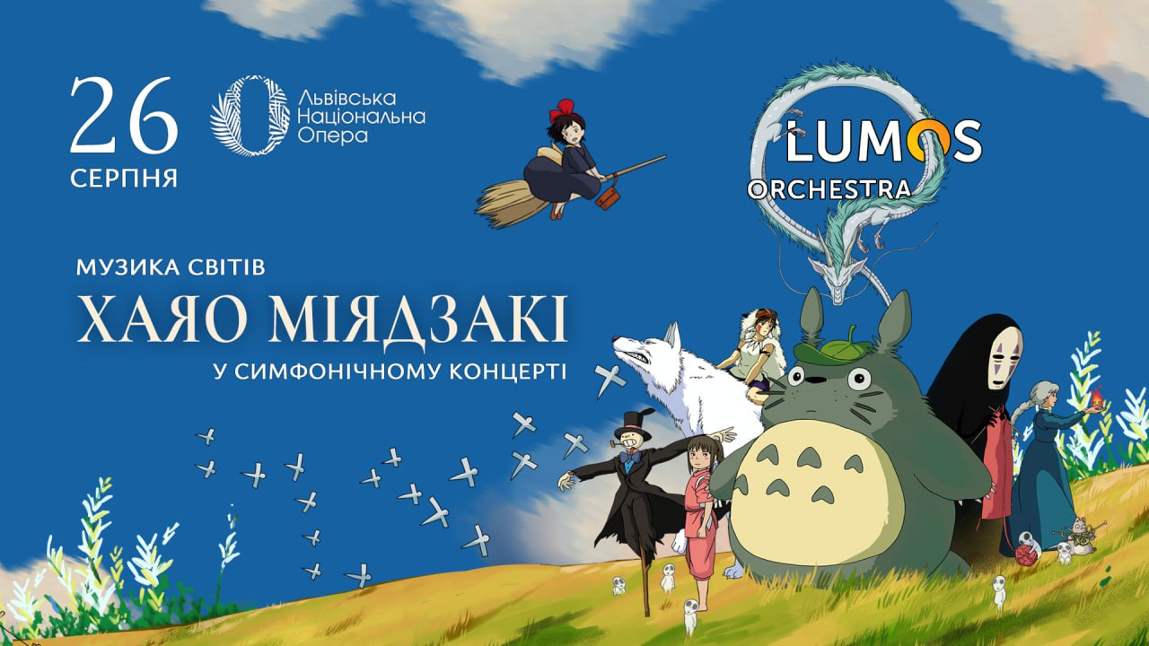 В понеділок, 26 серпня 2024 року, о 19.00 у Львівській опері відомий симфонічний оркестр LUMOS Orchestra пропонує і старшим і наймолодшим глядачам казковий концерт з анімаційним супроводом – музика світів Хаяо Міядзакі.