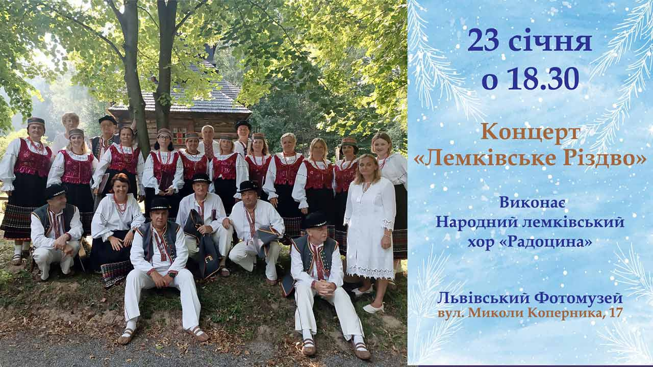 В четвер, 23 січня 2025 року о 18.30, у Львівському Фотомузеї (Львівський палац мистецтв, вул. Коперника, 17) відбудеться відбудеться концерт «Лемківське Різдво» Народного лемківського хору «Радоцина».