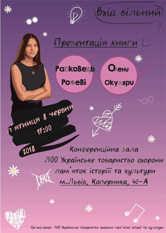 В п’ятницю, 8 червня 2018 року, о 17.00 в приміщення ЛОО Українського товариства охорони пам’яток історії та культури (вул. Коперніка, 40а) презентуватимуть книгу Олени Радковець “Рожеві окуляри”.