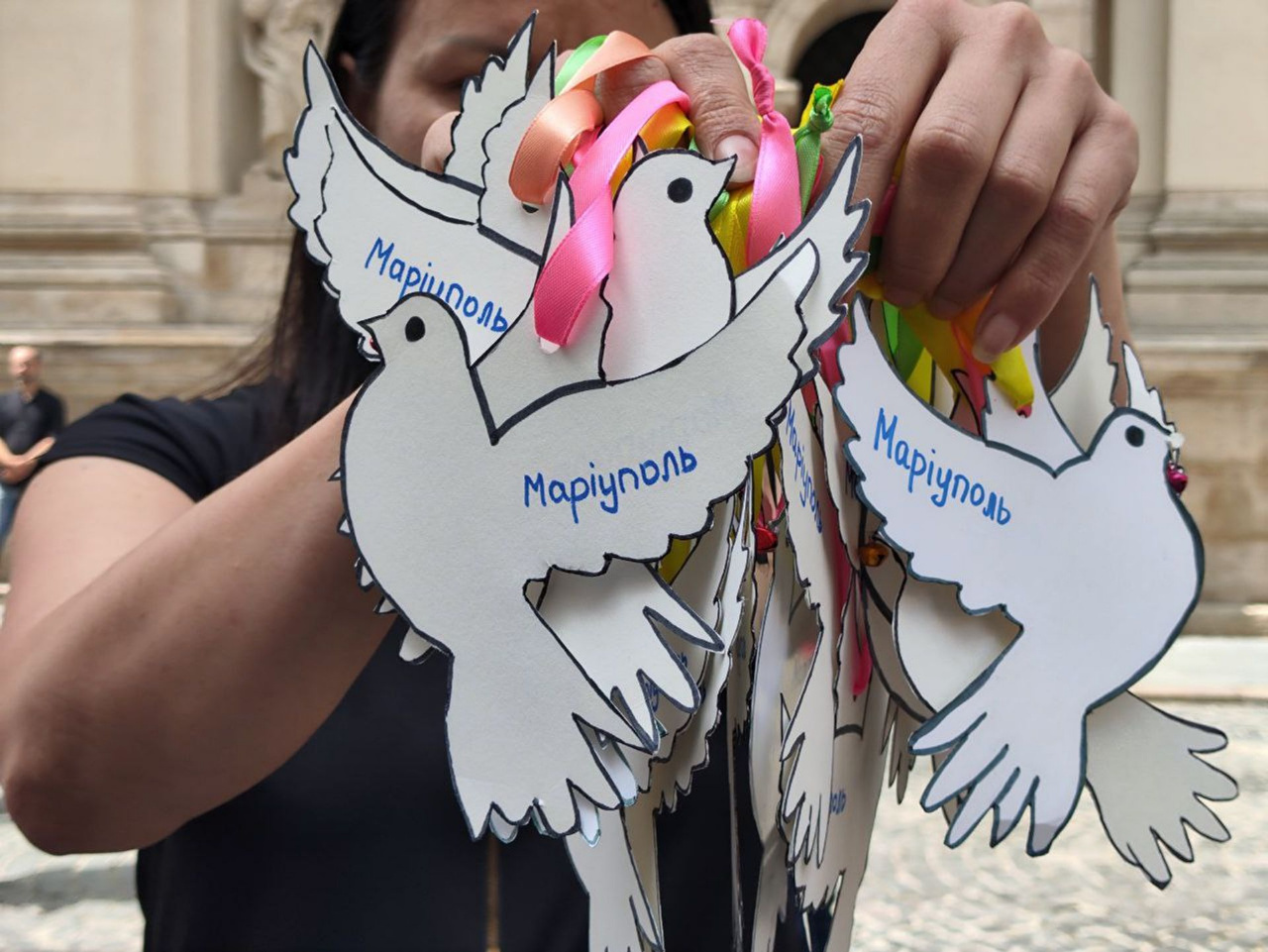 “Ми принесли таких голубів з дзвіночками, які зробили наші дітки. Вони символізують голоси дітей, які загинули. Офіційно наших маріупольців загинуло 92 дитини. Це дуже велика кількість, але це така спірна кількість. Але ми ще не знаємо, що буде далі. Ми все бачили і діти наші бачили, і ми бачили, бачили дуже багато. Прилітало і вдень, і вночі, і коли виїжджали. Дуже багато спалених автівок, багато трупів, як би це не звучало, тобто наші діти бачили все”, — ділиться представниця ГО “ЯМаріуполь” Наталія Бейда.