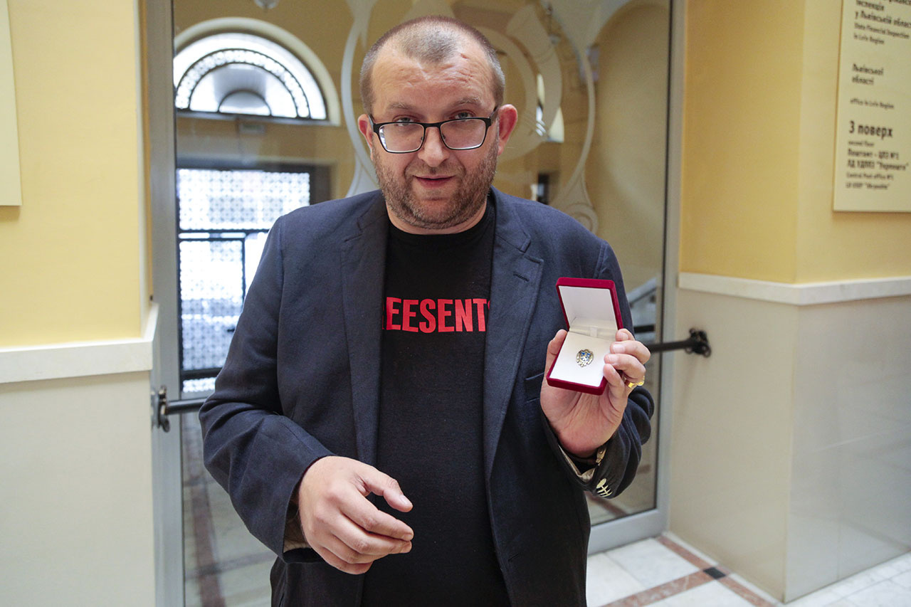 Автор ідеї – львівський журналіст Олег Радик. Власне вчора він святкував свій День Народження. І з цієї нагоди голова Львівської ОДА Олег Синютка привітав Олега Радика та подарував йому пам’ятний значок з логотипом Львівської ОДА.