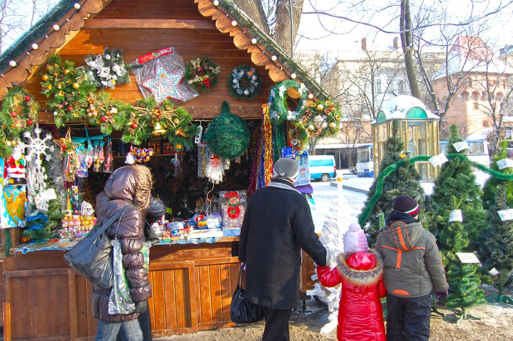 Тут можна придбати будь-які новорічно-різдвяні атрибути: ялинки будь-яких розмірів та кольорів, святкові гірлянди, ялинкові іграшки та багато іншого.