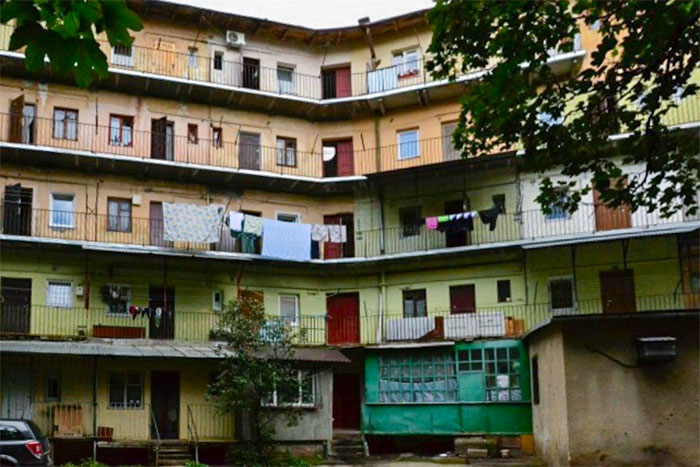 Ось вид того ж будинку із тильного боку. Стоячи у дворі, ми можемо бачити двері усіх квартир на кожному поверсі. Про таку особливість свого помешкання Хіґер згадував у розділі 8 частини 2 своїх спогадів.