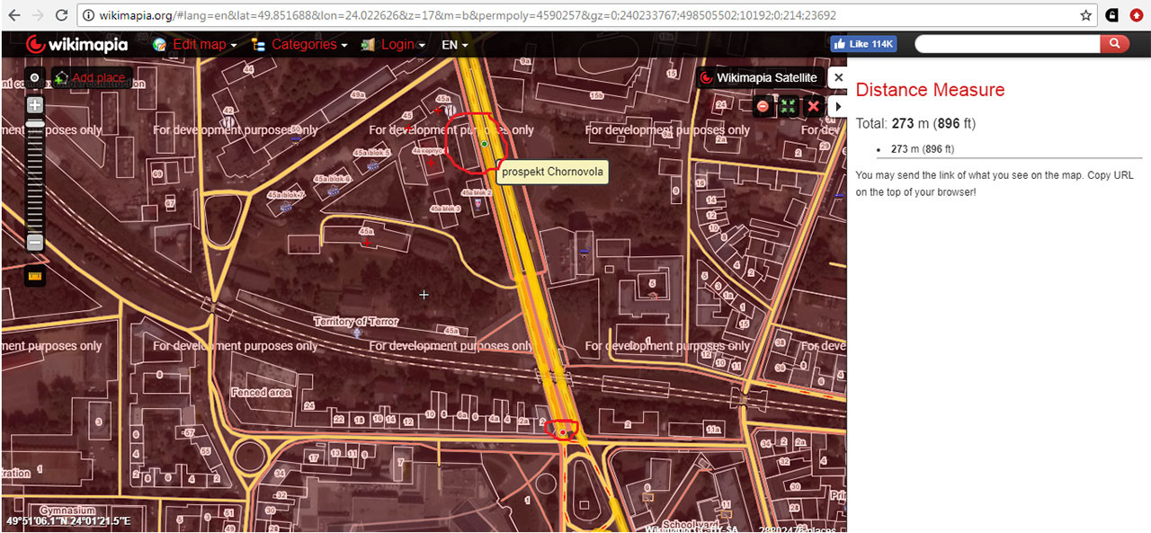 Мій ріст 1,7 м , отож довжина мого кроку рівняється 0,795 м. Множимо цю відстань на 344 кроки, і отримуємо 273,48 м. Тобто відстань від перехрестя Чорновола – Під Дубом до зазначеного отвору в стіні становить 273,48 м. Вимірюємо цю відстань у вікімапії: