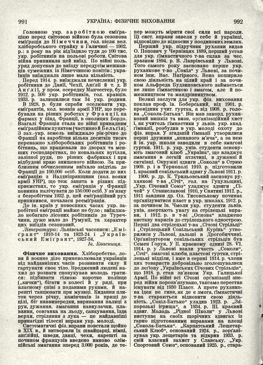 Між укр[аїнськими] еміґрантами в ЧСР працюють у Празі» «Союз укр[аїнського] сокільства за кордоном», оснований 1931. р. й «Укр[аїнський] січовий союз», оснований 1927. р.: «Канадійський український спортовий клюб» у Вінніпеґу, оснований 1926. р., стає до гри з анґл[ійськими] і фр[анцузькими] дружинами в ставку (бейзбол»). «Січовий Союз» у Америці» оснований 1917, уладжує летунські курси. В Арґентині основують «Соколи» від 1930. р.