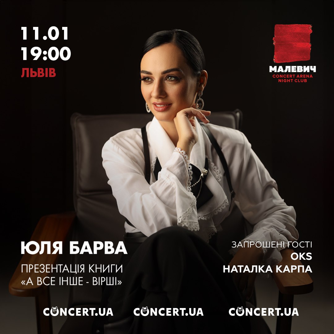 В четвер, 11 січня 2024 року, о 19:00 у Malevich Concert Arena (проспект Чорновола, 2) відбудеться презентація книги української поетеси і телеведучої Юлі Барви “А все інше – вірші”.