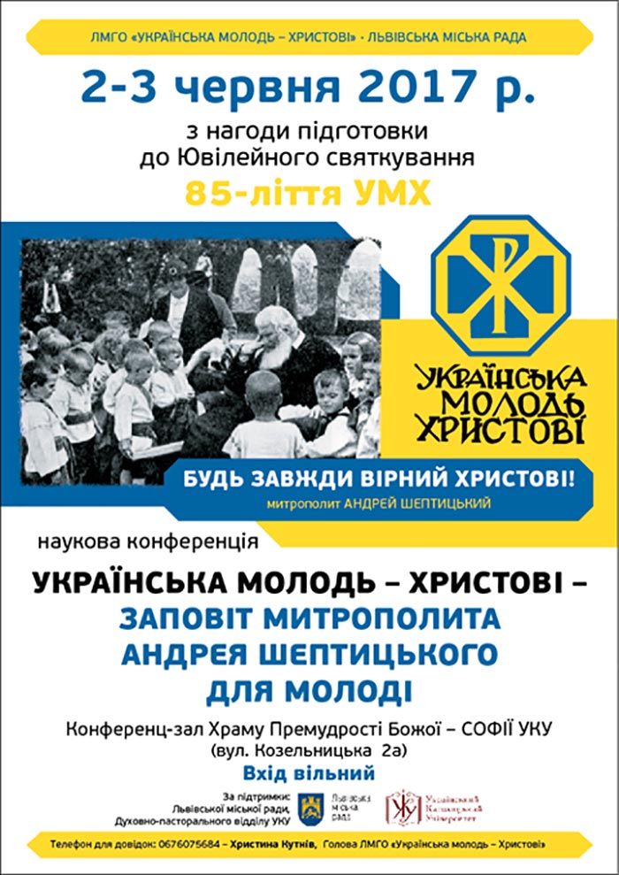 2-3 червня 2017 року у Храмі Премудрості Божої Софії УКУ (м. Львів, вул. Козельницька, 2а), відбудеться наукова конференція «Українська Молодь – Христові – заповіт Митрополита Андрея Шептицького для сучасної молоді». Організатор – Львівська міська громадська організація «Українська молодь – Христові». Захід відбувається за підтримки Львівської міської ради та духовно-пасторального відділу УКУ.
