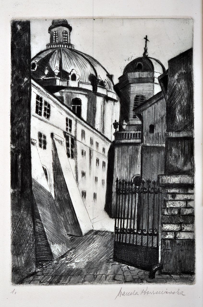 Графічне мистецтво першої половини XX століття презентують художники переважно львівської школи: Стефанія Гебус-Баранецька (серія листівок), Юзефа Кратохвиля-Відимська («Ворота школи. (Бенедиктинський монастир)»), Франциск Ковалишин («Ратуша у Львові після спалення 1848 року (з акварелі З. Дзєвонського)»), «З’явлення святих Ігнатія, Ксаверія і Станіслава Костки над Львовом 1623 року 28 серпня» (з рисунка І. Філіповича), Ванда Коженьовська («Костел домініканців», «Костел бенедиктинок»), Альфред Каменобродський «Королівський арсенал у Львові». Цікавими є роботи зі станкової графіки Маргарити Старовойт («Львівський університет імені Івана Франка»).