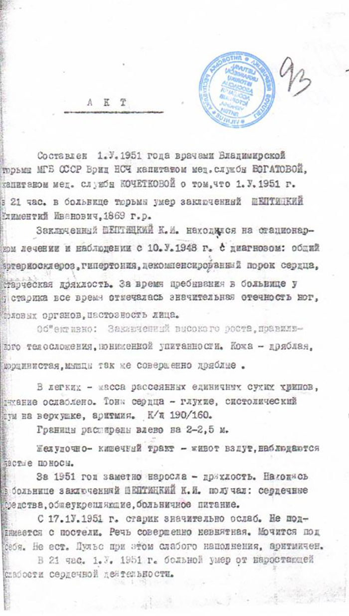 1 травня 1951 року о 21 год. 30 хв. лікарі медичного корпусу Владімірської в’язниці констатували смерть архімандрита о. Климентія — Казимира графа Шептицького. У медичній довідці лікарів Владімірської в’язниці МДБ СРСР повідомлялося про те, що 1 травня 1951 р. о 21 годині у в’язничній лікарні помер в’язень Шептицький Казимир Іванович, 1869 року народження. За медичним актом, архимандрит Климентій перебував на стаціонарному лікуванні під лікарським наглядом від 10 травня 1948 р. з діагнозом: загальний артеріосклероз, гіпертонія, декомпенсований порок серця, «стареча немічність». [Кримінальна справа Шептицького Казимира, арк. 351]