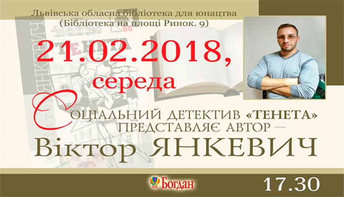 Сьогодні, 21 лютого 2018 року, о 17:30 у читальному залі Львівської обласної бібліотеки для юнацтва (Бібліотека на Ринку – площа Ринок, 9) відбудеться презентація книги Віктора Янкевича «Тенета» за участі автора та спеціального гостя – українського прозаїка, поета, літературознавця, краєзнавця, журналіста Сергія Синюка.