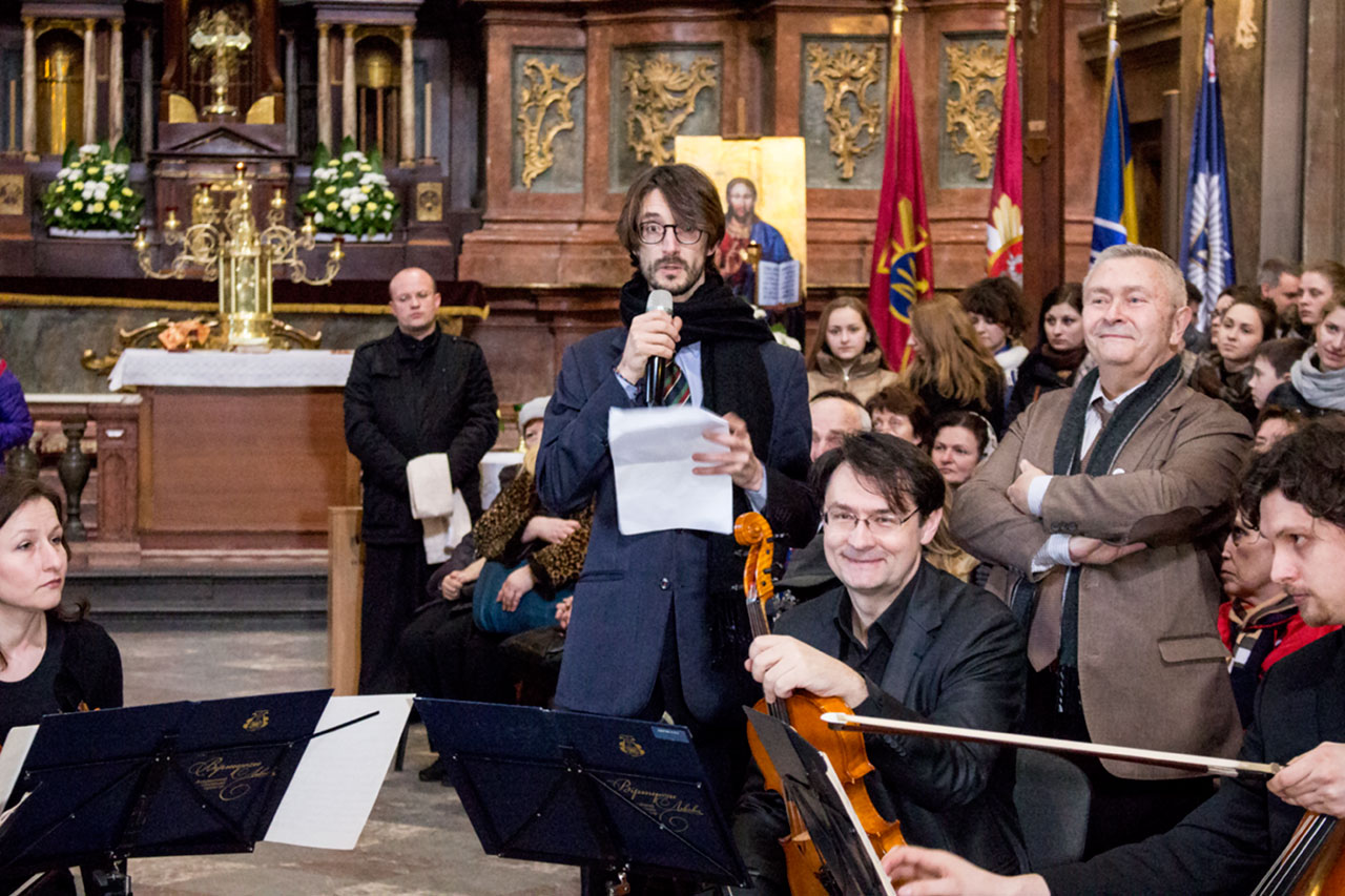 Перед початком концерту кілька слів до слухачів та музикантів сказав радник з питань культури і співробітництва Посольства Франції в Україні, директор Французького інституту в Україні Ерік Тозатті. Приємним є той факт, що пан Тозатті говорив українскьою мовою.