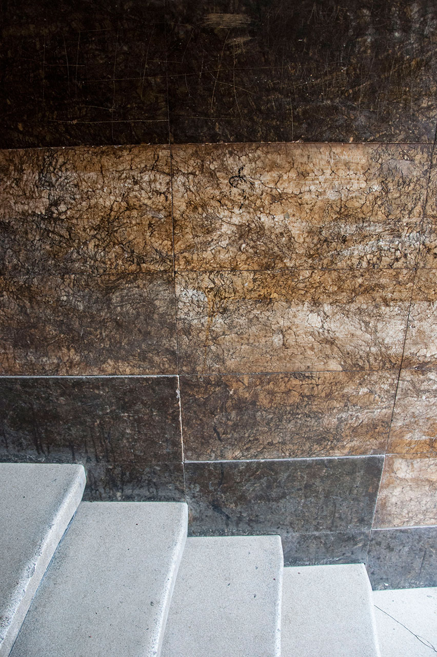 Двері та поручні в під’їзді виконані з дерева. Ритмічні узори створює залізна частина поручнів. Підлога виконана в класично чорно-білій плитці.