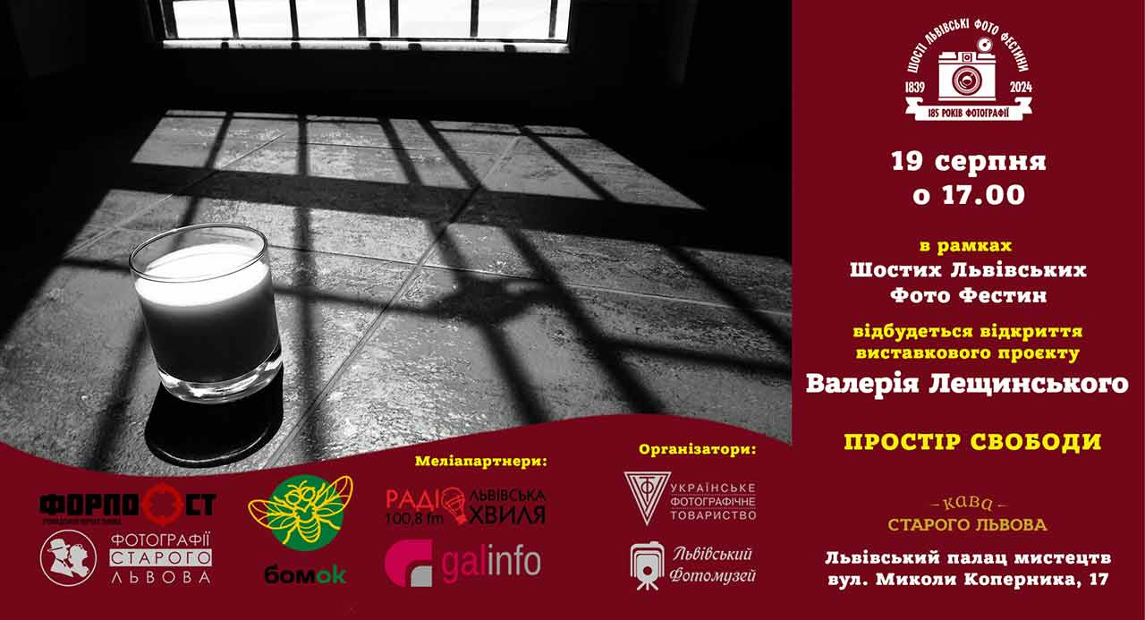 В понеділок, 19 серпня 2024 р. о 17 год., в рамках Шостих Львівських Фото Фестин, у Львівському палаці мистецтв (вул. М.Коперника, 17) відбудеться відкриття виставкового проєкту Валерія Лещинського “ПРОСТІР СВОБОДИ”.